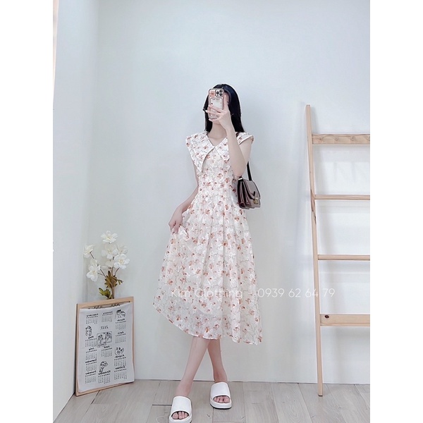 Giới thiệu [Hàng sẵn] Đầm hoa voan lụa sát nách cổ bèo nhọn 2 lớp tiểu thư - hình thật