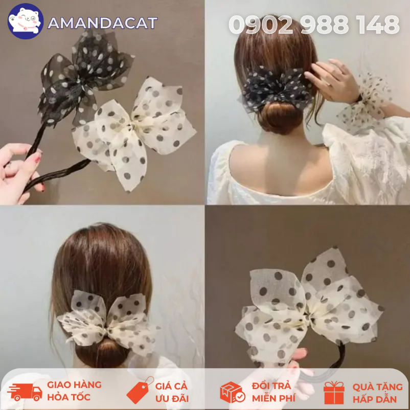 Mô tả Dây buộc tóc co dãn đính nơ to họa tiết chấm bi - Có 2 màu đen trắng - Cột tóc nữ - Chun buộc tóc