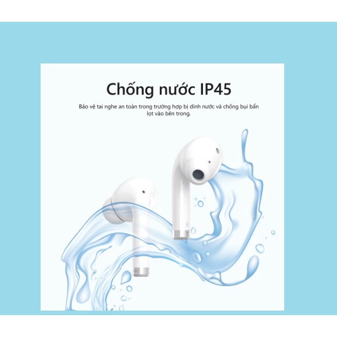 Chống nước IP45 Bảo vệ tai nghe an toàn trong trường hợp bị dính nước và chống bụi bẩn lọt vào bên trong Lọc nhiễu ENC cho đàm thoại rõ nét Lọc nhiễu ENC rất ấn tượng, loại bỏ đến 95% tạp âm. AirB đem đến âm thanh đàm thoại rõ nét, chân thực Tích hợp gọi nhanh trợ lý ảo Bấm 3 lần trên vị trí cảm ứng của tai nghe, bạn sẽ kết nối với trợ lý ảo như Google Assistant hay Siri Pin ấn tượng cho trải nghiệm kéo dài AirB có khả năng phát nhạc liên tục trong 6 giờ và có thể lên tới 21 giờ khi kết hợp với case sạc. Chạm để điều khiển Điều khiển chạm trên AirB vô cùng đơn giản và thuận tiện: gõ nhẹ 1 lần để phát hoặc tạm dừng, 2 lần để chuyển bài… Hộp sạc không khớp nối, tự đóng an toàn khi rơi Sáng tạo trong thiết kế, mang đến một hộp sạc không khớp nối, có khả năng tự đóng nắp trong trường hợp bị rơi để bảo vệ hộp sạch và tai nghe bên trong Dễ dàng kết nối, dễ dàng chuyển đổi Khả năng thu phát sóng mạnh mẽ cùng Bluetooth 5.0 cho phạm vi kết nối rộng, AirB dễ dàng kết nối và chuyển đổi qua lại các thiết bị mà bạn mong muốn Bảo hành chính hãng 12 tháng