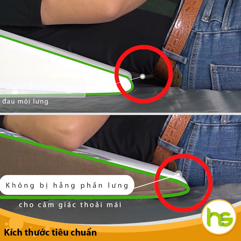 - Dài 70cm: đảm bảo một người lớn có thể đặt trọn vẹn phần thân trên từ đầu tới thắt lưng trên gối, nhằm đảm bảo toàn bộ cột sống được đặt trên mặt phẳng gối, TRÁNH CONG GẬP, GÂY HẠI CỘT SỐNG - Rộng 60cm: để người nằm xoay trở thoải mái trên gối - Cao 14 cm (tương đương độ dốc là 11.5 độ): thích hợp cho trẻ em hoặc những người có triệu chứng nhẹ nhàng, ít hơn 3 ngày/tuần. - Cao 22cm (tương đương độ dốc là 17.5 độ - được khuyến cáo bởi PGS Đặng Xuân Hùng, để phát huy tác dụng giảm trào ngược tốt nhất: phù hợp cho mọi đối tượng, đặc biệt là người có triệu chứng trào ngược từ 3 ngày/tuần trở lên. - Cao 18cm, dài 90cm (tương đương độ dốc là 11.5 độ - cải tiến từ loại cao 22cm nhằm tăng chiều dài của gối, giảm độ dốc giúp người dùng nằm được từ mông đến đầu, từ đó chống trượt tuyệt đối.