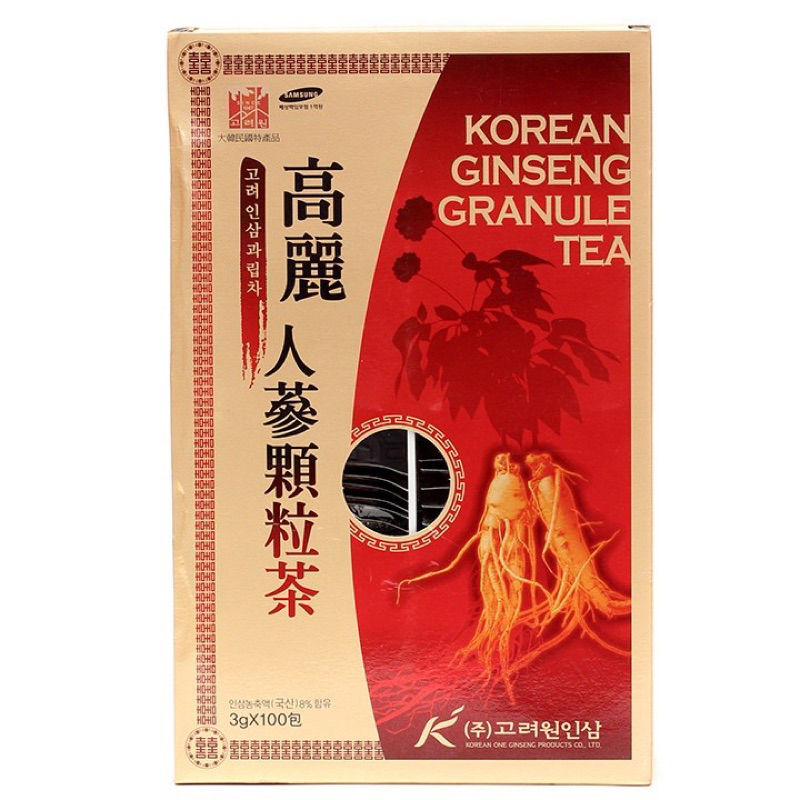 Giới thiệu sản phẩm Hộp trà nhân sâm Korean One Ginseng Korean Ginseng Tea Từ lâu, nhân sâm Hàn Quốc được biết đến với rất nhiều công dụng quý báu đối với sức khỏe con người. Sử dụng nhân sâm Hàn Quốc sẽ giúp điều hòa, tăng cường hệ miễn dịch cho cơ thể, tăng bạch cầu và tiểu cầu đồng thời tăng sức bền, giảm mệt mỏi, cải thiện suy nhược cơ thể, cải thiện thính giác, thị giác và tăng cường trí nhớ. Bên cạnh đó, nhân sâm có công dụng thanh lọc cơ thể rất tốt, đào thải độc tố để tăng cường chức năng gan, thận, kích thích tiêu hóa.