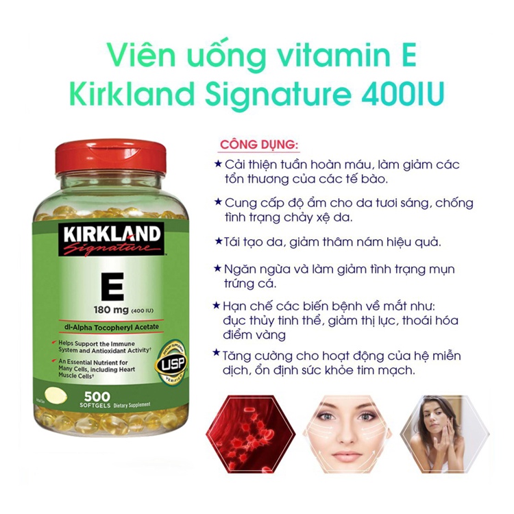 ** THÀNH PHẦN của Viên Uống Kirkland Vitamin E : Trong 1 Viên Uống Kirkland Vitamin E có chứa: - Vitamin E 400 I.U. với giá trị dinh dưỡng hàng ngày 1333% Công dụng: Viên Uống Kirkland Vitamin E Hỗ Trợ Làm Đẹp Da Và Chống Lão Hoá 500 viên - Vitamin E góp phần vào việc ngăn ngừa các chất chống oxy hóa cholesterol LDL, tránh tình trạng gây tổn thương tế bào. - Vitamin E 400 IU giúp cho da săn chắc, chống lại tình trạng chảy xệ. Cân bằng độ ẩm cho da, làm sáng da hơn, ngăn ngừa các nếp nhăn xâm nhập, giúp phục hồi và loại bỏ độc tố có hại và giảm thâm nám trên da. - Hỗ trợ cải thiện và làm giảm mụn trứng cá. - Hạn chế quá trình lão hóa da, các biến chứng có hại cho sức khỏe như gây đục thủy tinh thể, suy giảm thị lực và thoái hóa hoàng điểm ở tuổi già. - Đẹp da, tốt tóc: Bổ sung đầy đủ Vitamin E giúp cho da và tóc của chúng ta khỏe đẹp, mịn màng hơn: tình trạng gãy tóc, xơ tóc… cũng không còn xảy ra nếu bạn bổ sung đầy đủ Vitamin E cho cơ thể. - Những nghiên cứu gần đây cho thấy rằng Vitamin E giúp cho cơ thể giảm chuột rút, đau nhức cơ bắp hay các kỳ đau bụng kinh.