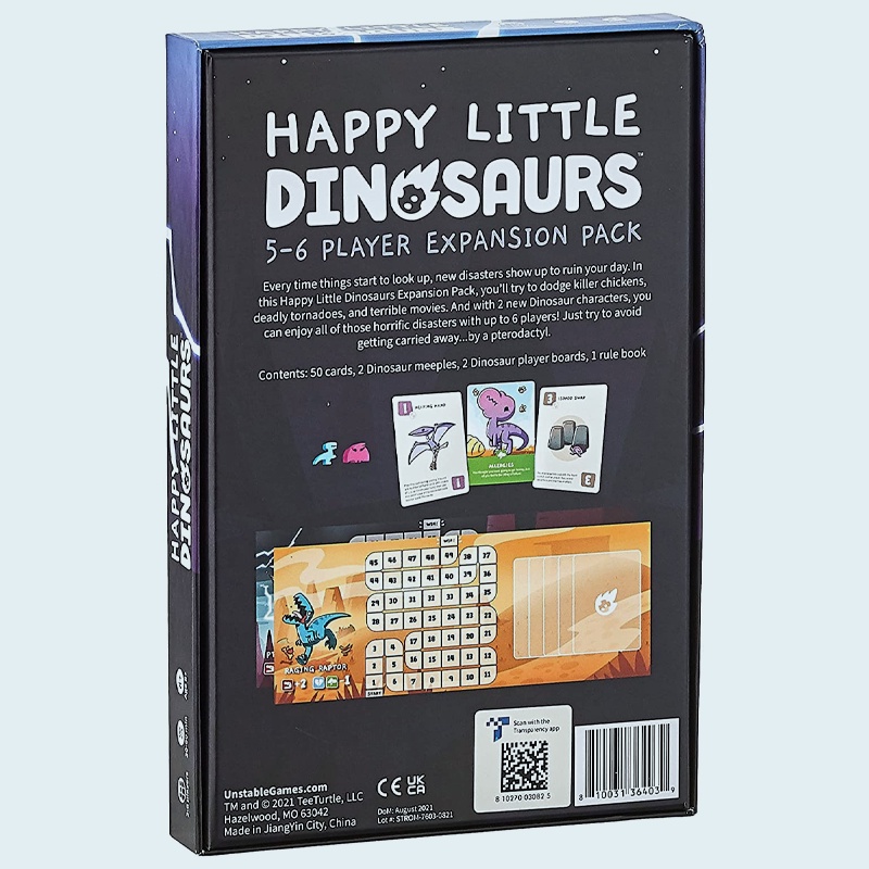 Happy Little Dinosaurs 5-6 Player Expansion được thiết kế để thêm vào Trò chơi bài Khủng long Nhỏ Vui vẻ của bạn. Hãy sẵn sàng đối mặt với những thảm họa mới và gặp nhiều Khủng long may mắn hơn! Bạn sẽ gây ra những nỗi kinh hoàng không thể tưởng tượng như gà giết người, cơn lốc xoáy chết người và những bộ phim khủng khiếp. Gói mở rộng 50 thẻ này giới thiệu 2 nhân vật Khủng long mới, giúp trò chơi có thể chơi được cho 2-6 người chơi. Bản mở rộng chứa 50 thẻ, 2 bảng trình phát khủng long, 2 meeples khủng long và 1 cuốn sách quy tắc.