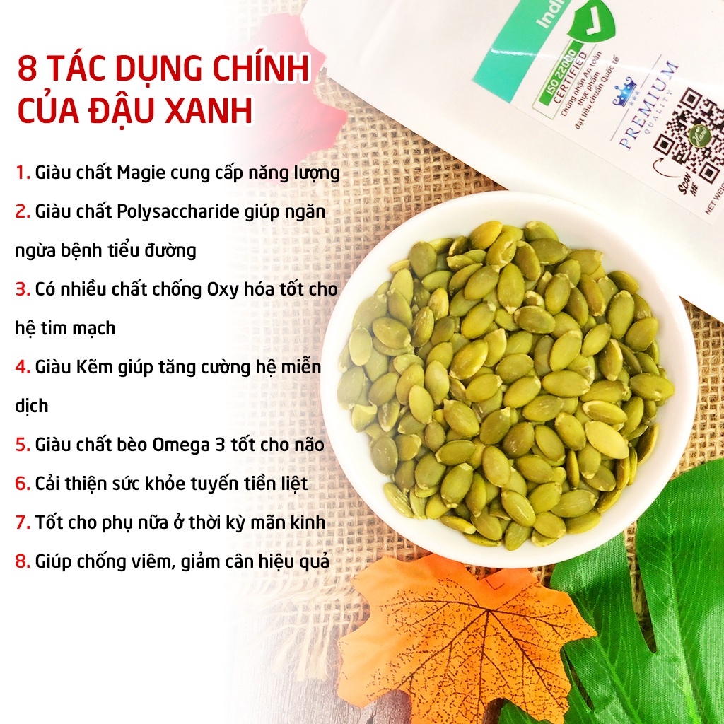 THÔNG TIN SẢN PHẨM HẠT BÍ XANH Thành phần: 100% nhân bí xanh tách vỏ sấy khô nhập khẩu Ấn Độ. Hình thức đóng gói: túi zip 100g, 200g, 500g và hộp nhựa 500g. * THÀNH PHẦN DINH DƯỠNG CỦA NHÂN HẠT BÍ XANH Hạt bí xanh chứa nhiều dưỡng chất cần thiết cho cơ thể như protein, chất béo, carbohydrate, vitamin E, A và các vitamin nhóm B, niacin, canxi, photpho và sắt. Chứa hàm lượng phytosterol, Hợp chất L- tryptophan cao Cung cấp kẽm và magnesi giúp cơ thể tạo ATP tổng hợp DNA, RNA Giàu omega 3 có chứa DHA và ARA * CÔNG DỤNG CỦA HẠT BÍ XANH - HỖ TRỢ GIẢM CÂN AN TOÀN - GIÚP MẸ BẦU ĐỠ MỆT MỎI, THAI NHI KHỎE MẠNH - GIÚP ĐẸP DA CHỐNG LÃO HÓA - NGỦ NGON GIẤC HƠN ....... * CÁCH SỬ DỤNG HẠT BÍ XANH - Ăn trực tiếp hoặc dùng làm bánh, làm sữa, làm granola..... *BẢO QUẢN HẠT BÍ XANH - Nơi khô ráo thoáng mát * CAM KẾT ✔️ Nguồn gốc rõ ràng ✔️ Quy trình chế biến đảm bảo theo Tiêu chuẩn vệ sinh An toàn thực phẩm ✔️ Trần Anh healthy sẽ hỗ trợ, giải quyết mọi vấn đề về đơn hàng Trước - Trong - Sau khi sử dụng sản phẩm với thái độ nhiệt tâm nhất * CHÍNH SÁCH ĐỔI TRẢ HÀNG KHI MUA HÀNG TẠI TỪ TÂM HEALTHY - Hoàn tiền & Miễn phí đổi trả 15 ngày trong trường hợp: - Sản phẩm thực tế không giống như ảnh & mô tả - Hàng bị lỗi, mốc, hỏng không thể sử dụng hoặc ảnh hưởng tới chất lượng Note: Nếu sản phẩm không đạt chất lượng, vui lòng nhắn tin hoặc gọi điện Hotline 0988196410 hỗ trợ nhanh nhất bạn nhé!