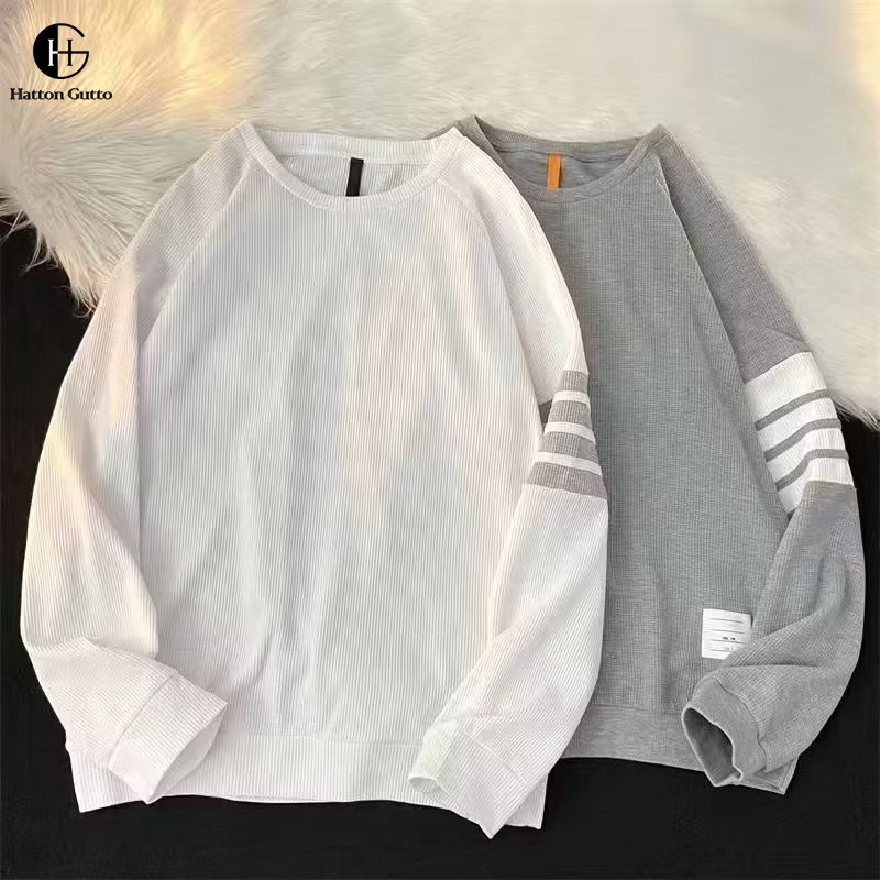 Thời Trang Nam > Áo Hoodie, Áo Len & Áo Nỉ > Áo Nỉ > Hattongutto COD OOTD Áo Sweater Mỏng Chui Đầu Cổ Thuyền Mùa Thu Cổ Điển Bốn Sọc Cho Cặp Đôi Nam Và Nữ