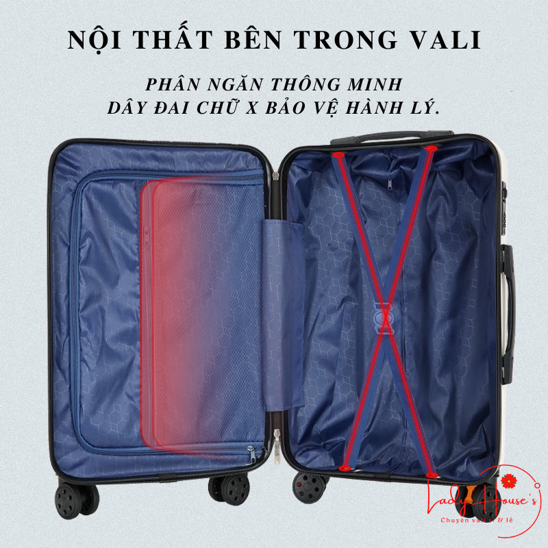 ► ĐẶC ĐIỂM: ✅ Thành phần chính của vali được làm từ nhựa PC+ABS giúp vali bền và chịu lực tốt hơn, bảo vệ hành lý của bạn không sợ hư vỡ khi có những va đập mạnh. ✅ Cần kéo được làm từ hợp kim nhôm, tránh được việc rỉ sét và giảm được khối lượng cho vali, có phân nấc dễ dàng điều chỉnh độ dài để phù hợp với chiều cao của người sử dụng. ✅ Khóa mật mã 3 số giúp bạn an tâm hơn về việc bảo vệ hành lý, tư trang của mình. ✅ Bánh xe đôi xoay 360 độ được làm từ cao su, chống ồn hiệu quả trên mọi địa hình. ✅ Bề mặt vali được sản xuất theo kiểu vân nhám giúp vali của bạn hạn chế trầy xước tối đa. ✅ Nội thất bên trong tiện dụng, với chất liệu vải 2 lớp, đai khóa chữ X giúp phân cách đồ đạc ngăn nắp gọn gàng, không bị lộn xộn ✅ Mẫu đẹp, màu sắc hài hòa, nhiều màu cho bạn dễ dàng chọn lựa hơn.