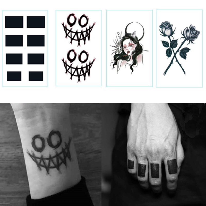 Hình xăm dán tạm thời này có thể giữ được lâu với thiết kế dạng vuông họa tiết hình hoa hồng đen, tình yêu, chú hề, phù thuỷ không thấm nước phù hợp dán ở cổ tay