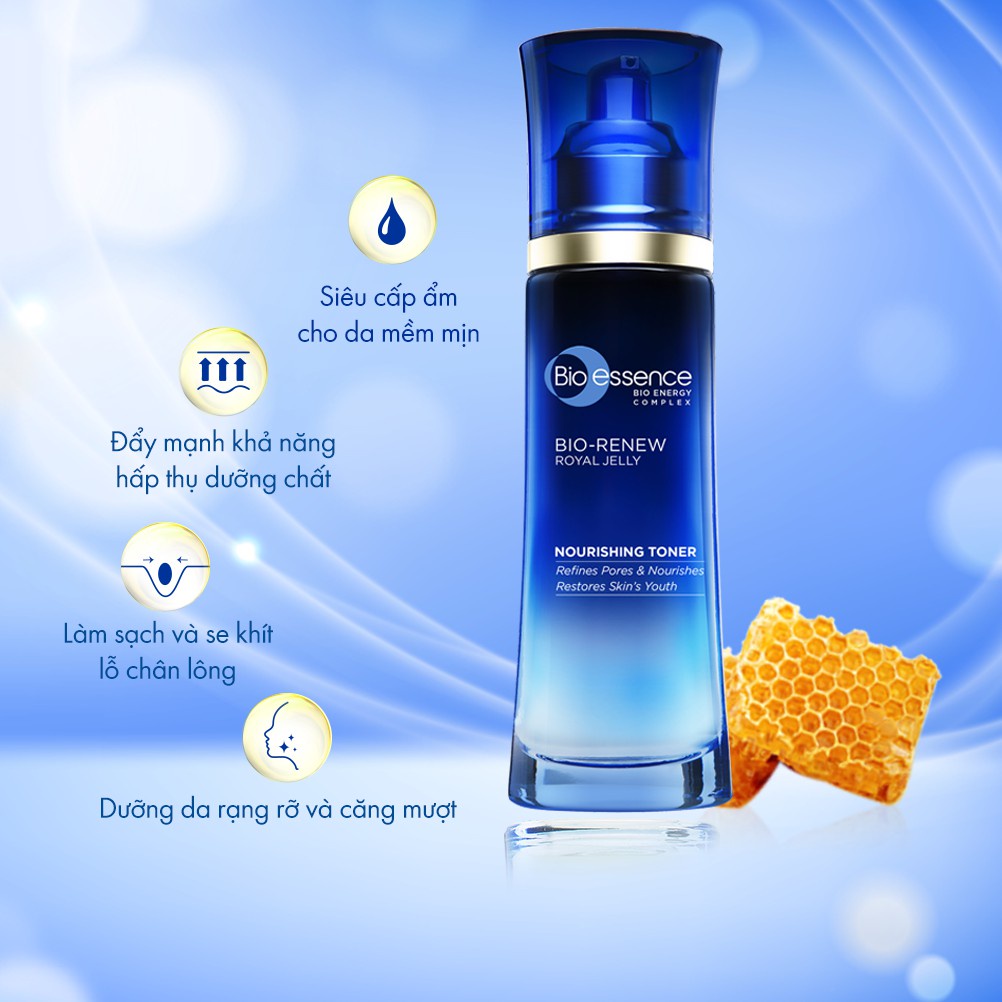 CÔNG DỤNG - Chiết xuất Sữa Ong Chúa cao cấp: duy trì làn da săn chắc, đàn hồi và tràn đầy sức sống - Hyaluronic Acid: cung cấp độ ẩm tối ưu, giữ da luôn mềm mịn và ẩm mượt - Chiết xuất Yến Mạch: tái tạo và dưỡng ẩm - Chiết xuất Cam Thảo:giúp da khỏe mạnh - Công thức độc quyền Bio-Energy Complex: giúp da hấp thu dưỡng chất tốt hơn, nuôi dưỡng, làm tươi mới và đem đến một làn da tươi trẻ, thon gọn