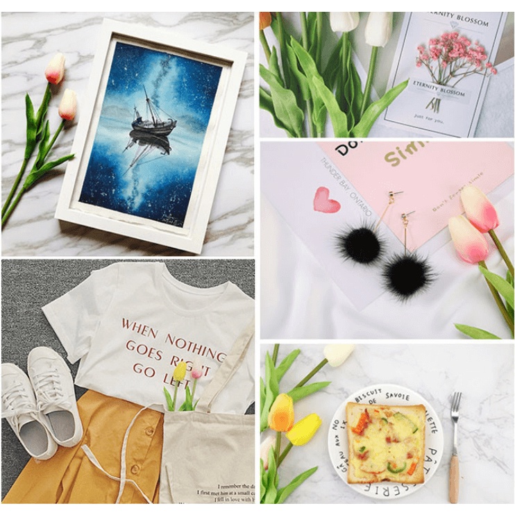 Hoa Tulip Giả Decor Chụp Ảnh được rất nhiều concept và sản phẩm khách nhau nhứ: quần áo, mỹ phẩm, giày dép, phụ kiện,.... Bông giả trang trí phòng khách, phòng ngủ, dùng để cắm bình để bàn rất đẹp ạ. Hoa Tulip giả được mô phổng giống thật, chất liệu cao cấp nên rất được ưa chuộng ạ.