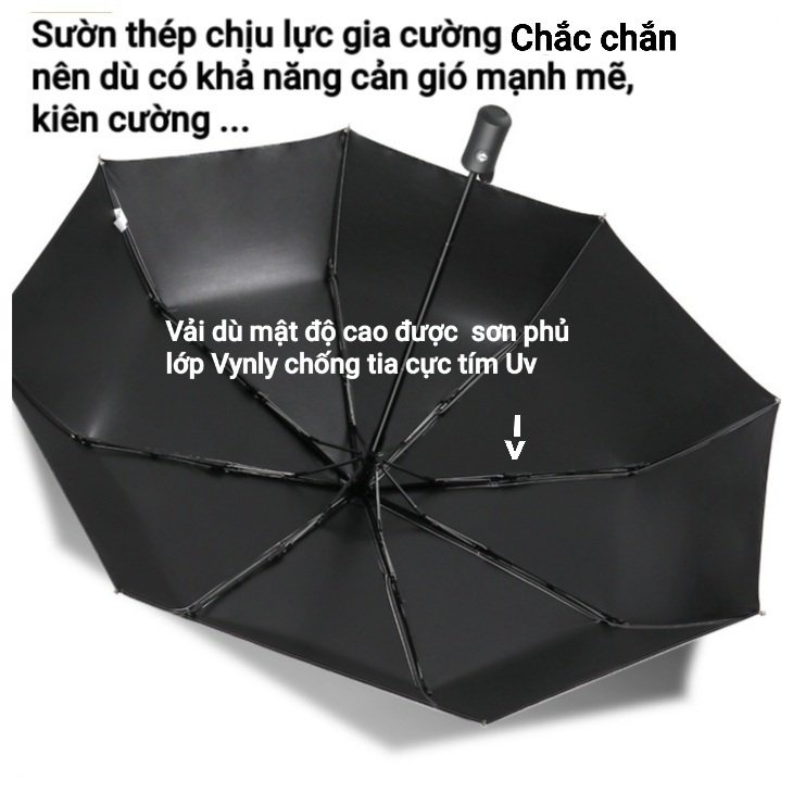 2. ĐẶC ĐIỂM NỔI BẬT SẢN PHẨM: - Sản xuất trên dây chuyền công nghệ hiện đại, Dù được cải tiến chỉ cần bấm nút dù sẽ tự động bung ra che nắng mưa một cách nhanh chóng, hoặc cũng bấm nút dù sẽ tự động cụp lại ngay. - Với kiểu dáng thanh lịch hiện đại có 5 màu sắc khác nhau giúp khách hàng thoải mái lựa chọn. - Kích thước nhỏ gọn không chiếm diện tích trên xe hơi là phụ kiện không thể thiếu, đồng hành cùng bạn trên mọi nẻo đường. - Xương dù được bố trí từ 8 nan xương, được làm bằng thép cứng cao cấp chắc bền không dễ bị uốn cong hay gãy khi gặp gió to, mưa lớn. - Giá đỡ bằng thép được phủ sơn đen chống gió mạnh mẽ. - Sườn thép sơn đen chịu lực tốt. - Bề mặt vải dù chống nước cực kì tốt, với hiệu ứng lá sen nước trượt rơi tự do. - Dù rộng thoải mái sử dụng cho 2 người. - Bề mặt vải dù được phủ hợp chất vinyl giúp chống các tia cực tím giúp bảo vệ làn da của các bạn dưới ánh nắng mùa hè. - Những ưu điểm đặc biệt: + Dù cao cấp tự động hoàn toàn mới và tiện lợi. + Vải dù với chất liệu vinyl chống tia UV. + Khung xương được làm từ thép đen chống chịu lực tốt. + Kiểu dáng sang trọng thanh lịch hợp thời trang.