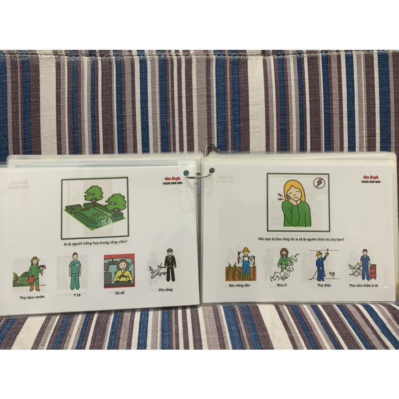 Ban đầu ba mẹ dạy con tên của các đối tượng có trong hình, sau đó nói cho con biết về công việc/nghề nghiệp- chức năng của người hay đồ vật có trong hình. Khi con nhớ dc rồi thì cho con nói lại, hỏi để con trả lời có thể chuyển thành câu đố để mẹ đố bé và ngược lại bé đố ba mẹ