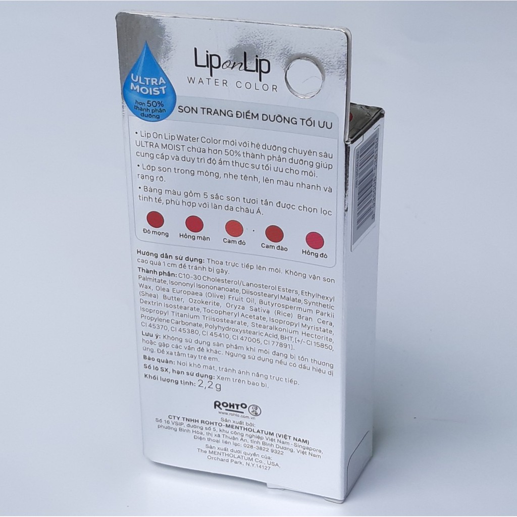 1 - Điểm Nổi Bật Của Sản Phẩm: - Lip On Lip Water Color mới với HỆ DƯỠNG CHUYÊN SÂU ULTRA MOIST chứa hơn 50% thành phần dưỡng giúp cung cấp và duy trì độ ẩm thực sự tối ưu cho môi. - Lớp son trong mỏng, nhẹ tênh, lên màu nhanh và rạng rỡ. - Bảng màu gồm 5 sắc son tươi tắn được chọn lọc tinh tế, phù hợp với làn da châu Á.