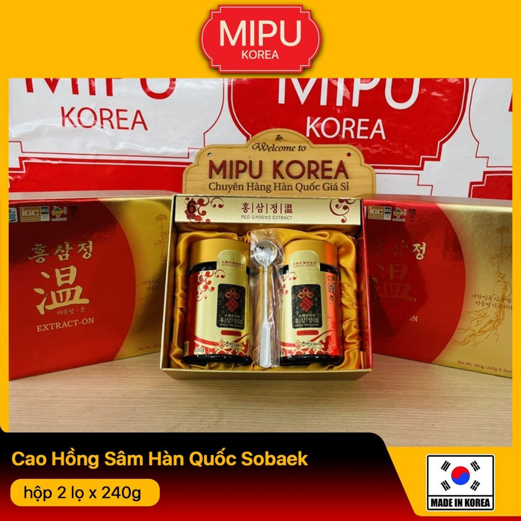 Cao Hồng Sâm Hàn Quốc Sobaek hộp 2 lọ x 240g Xuất Xứ : Hàn Quốc Thương Hiệu : Sobaek Quy cách : hộp 2 lọ x 240g HSD : 35 tháng kể từ ngày sản xuất Bảo Quản : Nơi thoáng mát khô ráo tránh ánh sáng trực tiếp MIPU KOREA Cam Kết Hàng Chính Hãng 100% ---------------------------------------------- Thành Phần : - Cao hồng sâm Hàn Quốc là sản phẩm được chiết xuất từ những củ sâm tươi 6 năm tuổi, kết hợp cùng các thảo dược quý hiếm như linh chi, bạch chỉ, xuyên khung...Qua nhiều công đoạn hấp sấy, kết quả thu được là thành phần Saponin vô cùng quý hiếm là Gingsenoside Rg và Rb. - Chiết xuất từ hồng sâm Geumsan 6 năm tuổi nguyên củ chiếm 0.15% (hàm lượng Saponin hơn 70mg/g), mật ong rừng, cùng 1 số thảo dược quý hiếm khác... Công Dụng: Cao Hồng Sâm Sobaek 6 năm tuổi Quy cách : Hộp 2 lọ x 240gr