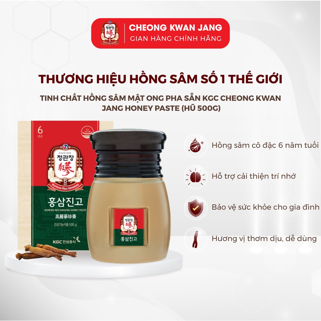 - Tên sản phẩm: Hồng Sâm Mật Ong KGC Cheong Kwan Jang Honey Paste (Hũ 100g, 500g) - Tinh Chất Hồng Sâm Mật Ong Pha Sẵn KGC là sự kết hợp giữa tinh chất hồng sâm 6 năm tuổi của Cheong Kwan Jang cùng với địa hoàng, phục linh, mật ong cùng các nguyên liệu khác. - Sản phẩm hồng sâm Hàn Quốc được sản xuất bằng bí quyết và kỹ thuật chế tạo hồng sâm được tích lũy trong hơn 1 thế kỷ của Cheong Kwan Jang, là sản phẩm mang hương vị nhẹ nhàng cho cả gia đình cùng thưởng thức.