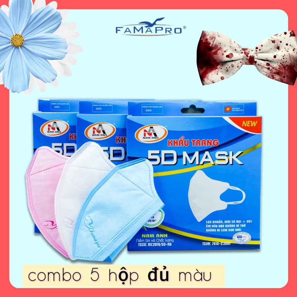 Giới thiệu [HỘP-5D MASK-QUAI THUN] COMBO 5 HỘP Khẩu trang y tế kháng khuẩn 3 lớp Famapro 5D Mask đủ màu