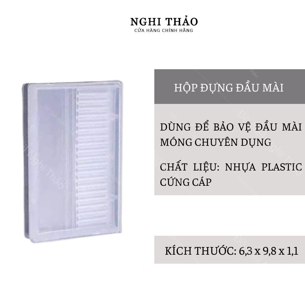 * Thông tín sản phẩm - Hộp đựng đầu mài móng là dụng cụ bảo quản đầu mài của các tiệm, học viện và các thợ Nail chuyên nghiệp. - Hộp có nắp bảo quản đầu mài không bị rơi mất hay tránh bụi bẩn bám vào đầu mài khó vệ sinh. - Nắp bấm chắc chắn, không lỏng lẻo - Chất liệu: Nhựa plastic cứng cáp - Màu sắc: Nhựa trắng trong - Kích thước: chiều dài 11cm, chiều rộng 6cm, chiều cao 1.1cm