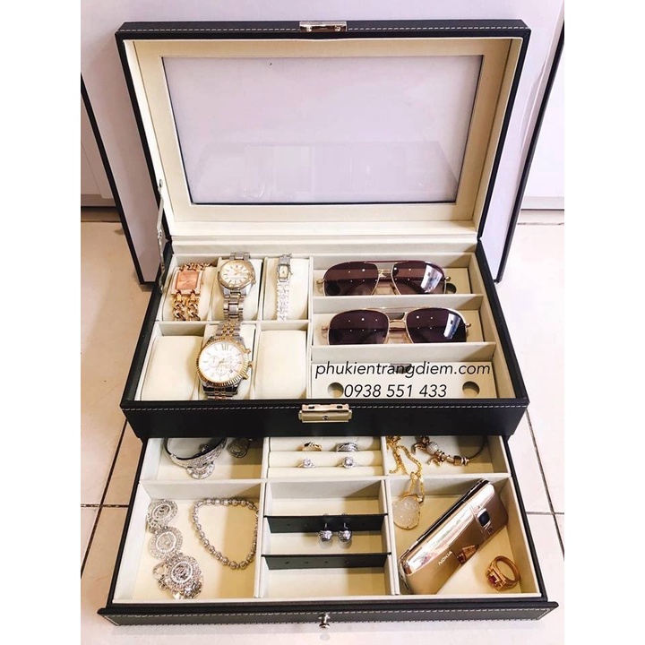 - Với tihết kế 2 tầng có thể đựng được tất cả các phụ kiện như đồng hồ trang sức và mắt kính.