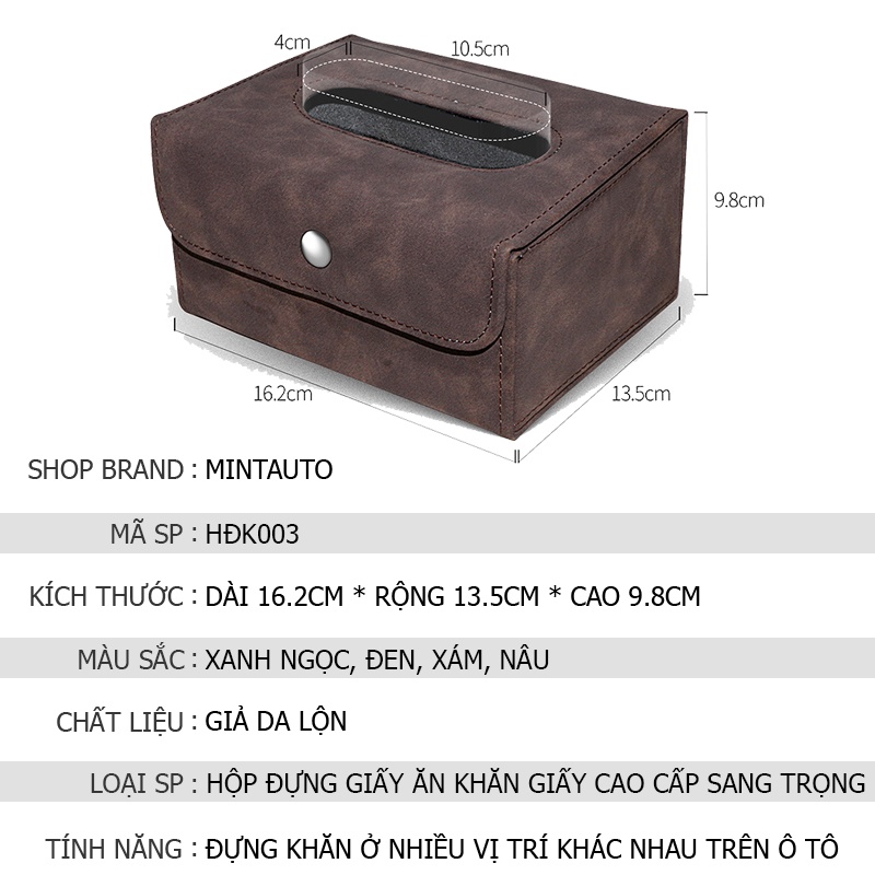 Tính năng - Đựng Khăn Giấy và trang trí không gian nội thất xe - Giúp bạn để khăn giấy gọn gàng và không bị bụi bẩn, đảm bảo vệ sinh. - Bọc da cao cấp chống xước, chống nước, dễ dàng vệ sinh. - Màu sắc sang trọng, hộp để trên đầu xe hoặc phía sau xe đều sang trọng và tiện ích.