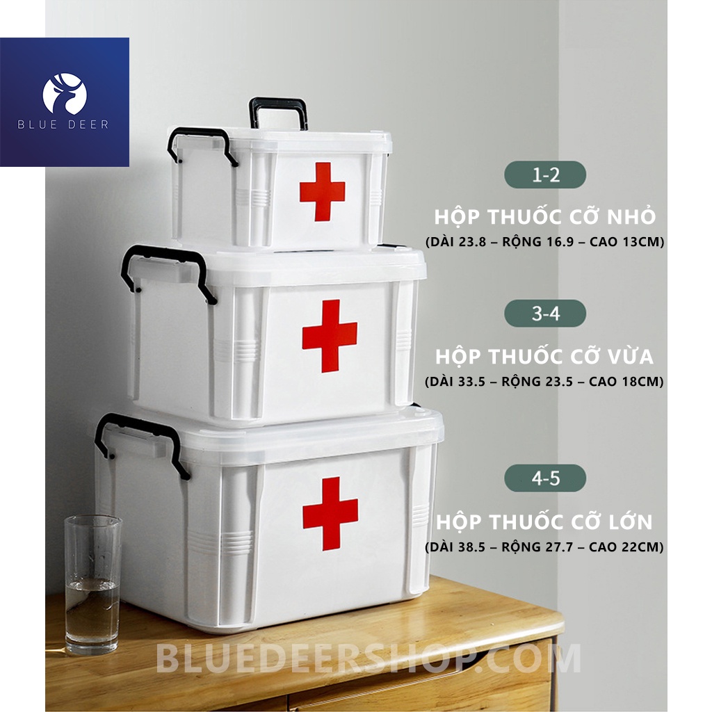 • Hộp Thuốc Gia Đình - Cỡ Vừa để cốp sau Xe Oto hoặc gia đình 3-4 người: Dài 33.5 – Rộng 23.5 – Cao 18CM.
