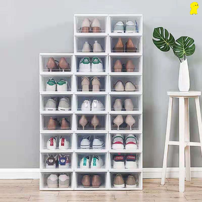 Đặc trưng: Chất liệu - Hộp đựng giày được làm từ chất liệu nhựa PP mới, thiết kế dày dặn hơn. Có khả năng chịu lực, chịu lực tốt, chống biến dạng nên yên tâm hơn. Kích thước - 31.5 x 21.3 x 12cm / 12.4" x 8.38" x 4.72" (S), 33.5 x 23.5 x 13cm / 13.1" x 9.25" x 5.1" (L). Trong suốt - Thiết kế nắp trong suốt cho phép bạn nhìn thấy những gì bên trong hộp giày mà không cần tháo hộp giày ra. Thuận tiện hơn cho bạn để lựa chọn. Không chỉ có thể để giày dép mà cũng có thể để quần, áo và đồ lót. Sử dụng rộng rãi - Thích hợp để đựng giày nam và giày nữ. Nếu bé nhà bạn đang đi học nội trú thì chiếc hộp đựng giày có thể xếp chồng này là lựa chọn tốt nhất. Thiết kế thân thiện với môi trường - Thiết kế kiểu dáng đẹp mới của hộp đựng giày trong suốt giúp bạn dễ dàng lấy đồ ra khỏi hộp. Thiết kế khóa hai bên độc đáo giúp bạn dễ dàng khóa hộp giày. Tiết kiệm không gian - Vấn đề cất giữ giày có thể dễ dàng giải quyết chỉ với một góc nhỏ khi sử dụng hộp đựng giày này. Hộp đựng giày không dùng đến có thể mở ra để tiết kiệm diện tích và dễ dàng lắp ráp, tháo rời.