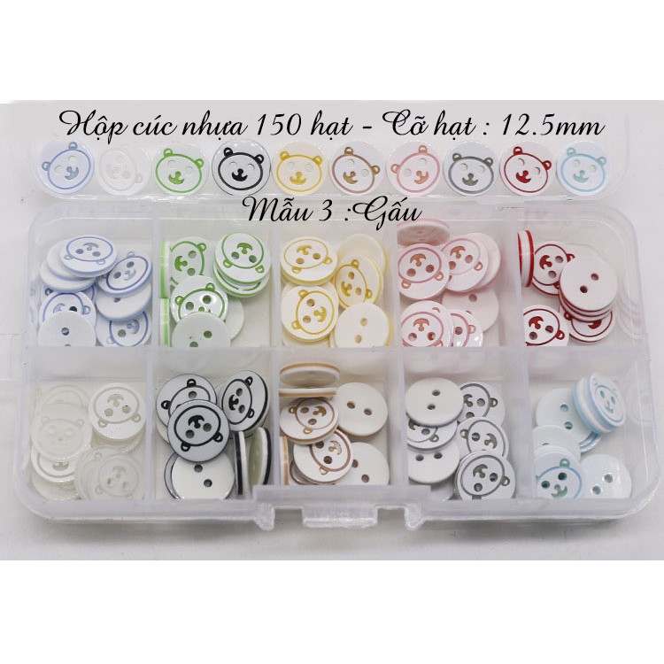 Hộp nút nhựa 150 hạt các mẫu nút thú xinh xắn 10 màu, cỡ nút 12.5mm - Len sợi phụ kiện Đà NẵngGiá MEDUSA