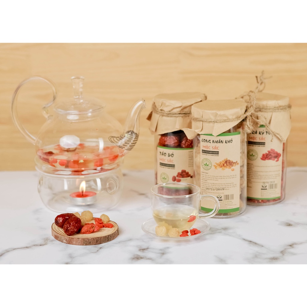 Có 2 loại để quý khách lựa chọn: 1. Combo 3 lọ trà - Thành phần: 01 lọ Trà kỷ tử sấy khô Mộc Sắc cao cấp 01 lọ Trà táo đỏ sấy khô Mộc Sắc cao cấp 01 lọ Trà hoa long nhãn sấy khô Mộc Sắc cao cấp - Quy cách đóng gói: lọ thủy tinh - Trọng lượng: 1420g 2. Set quà: - Thành phần: combo 3 lọ trà + 1 hộp đựng quà - Hộp đựng quà bao gồm 01 vỏ hộp đựng hình chữ nhật bằng bìa cứng in logo Siêu thị thiên nhiên 01 bộ dây lót hộp đẹp và êm (vàng, trắng, xanh...) Kích thước vỏ hộp quà: (d,r,c) 30x20x10 Tặng: 01 túi xách giấy cứng, sang trọng có dây quai in logo Siêu thị thiên nhiên