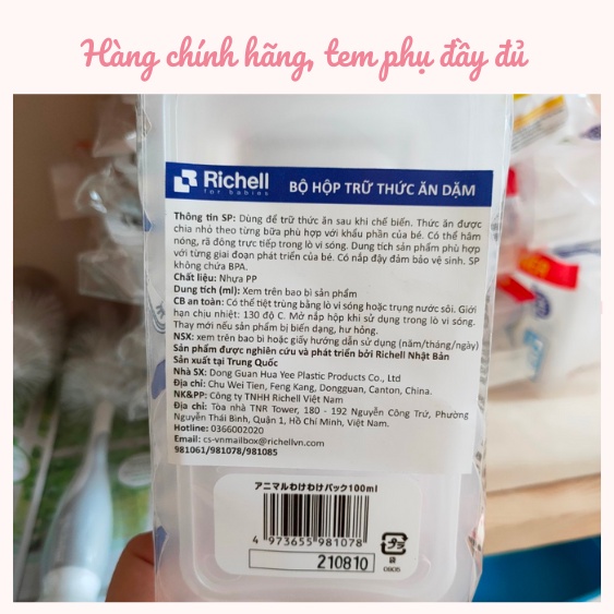 📌 Đặc điểm sản phẩm: - Công dụng: dùng để trữ thức ăn. Chia nhỏ thức ăn theo từng bữa phù hợp với khẩu phần của bé. - Chất liệu: Nhựa PP, không chứa BPA - Dung tích: 50ml, 100ml, 150ml, phù hợp với từng giai đoạn phát triển của bé. - Có thể rã đông, tiệt trùng bằng lò vi sóng, chịu nhiệt đến 130 độ C. - Phân phối bởi Công ty TNHH Richell Việt Nam