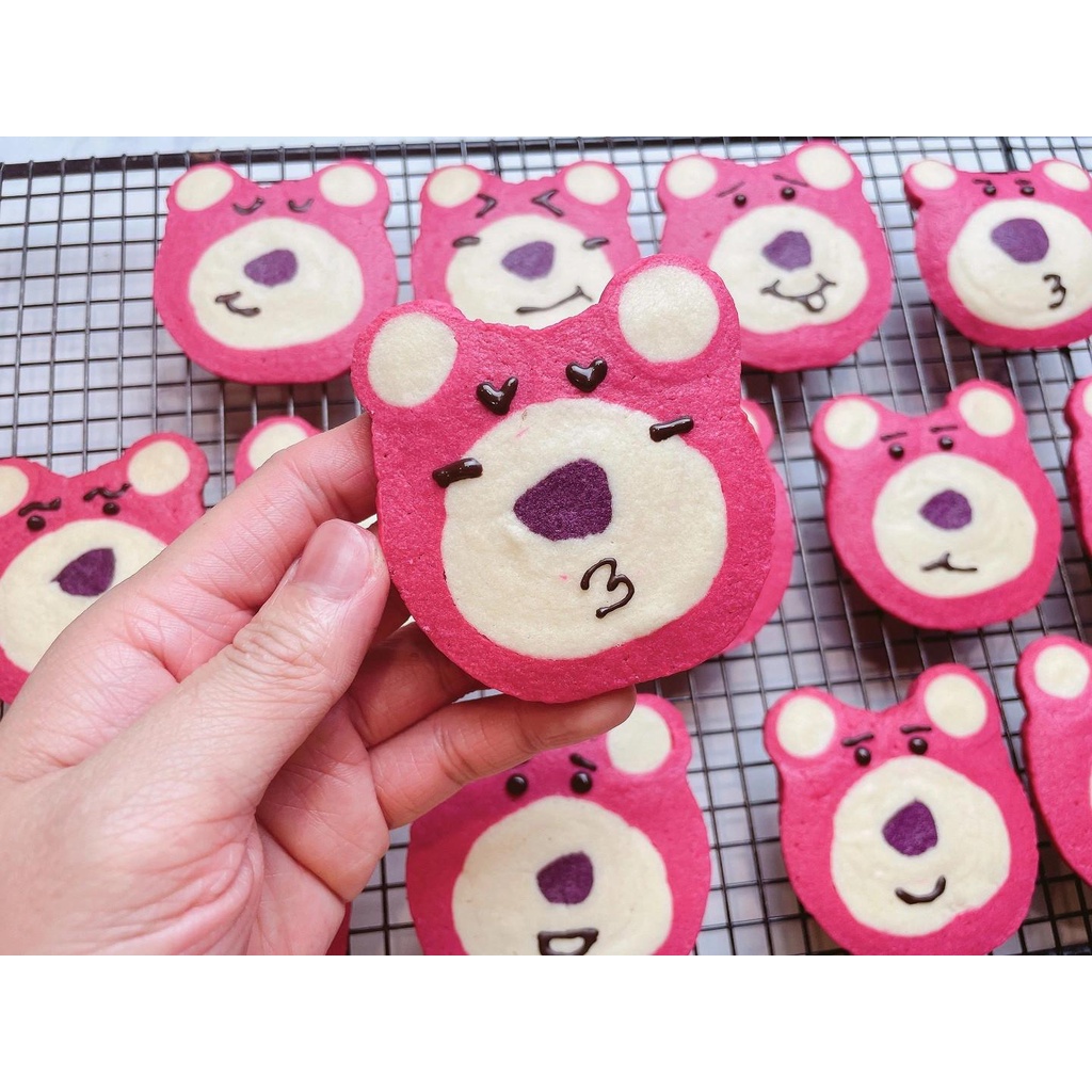 Tự tay làm bánh quy hình Gấu dâu Lotso cực kì cute với set nguyên liệu nhà Bee Bột mì 11 180g Bơ 60g Đường bột 60g Màu hồng cánh sen 15g Màu tím hoa quà 3g Socola chip 10g Túi hộp đựng 2 chiếc Giấy nến, găng tay 1 bộ 1 tờ hướng dẫn bao gồm hình ảnh