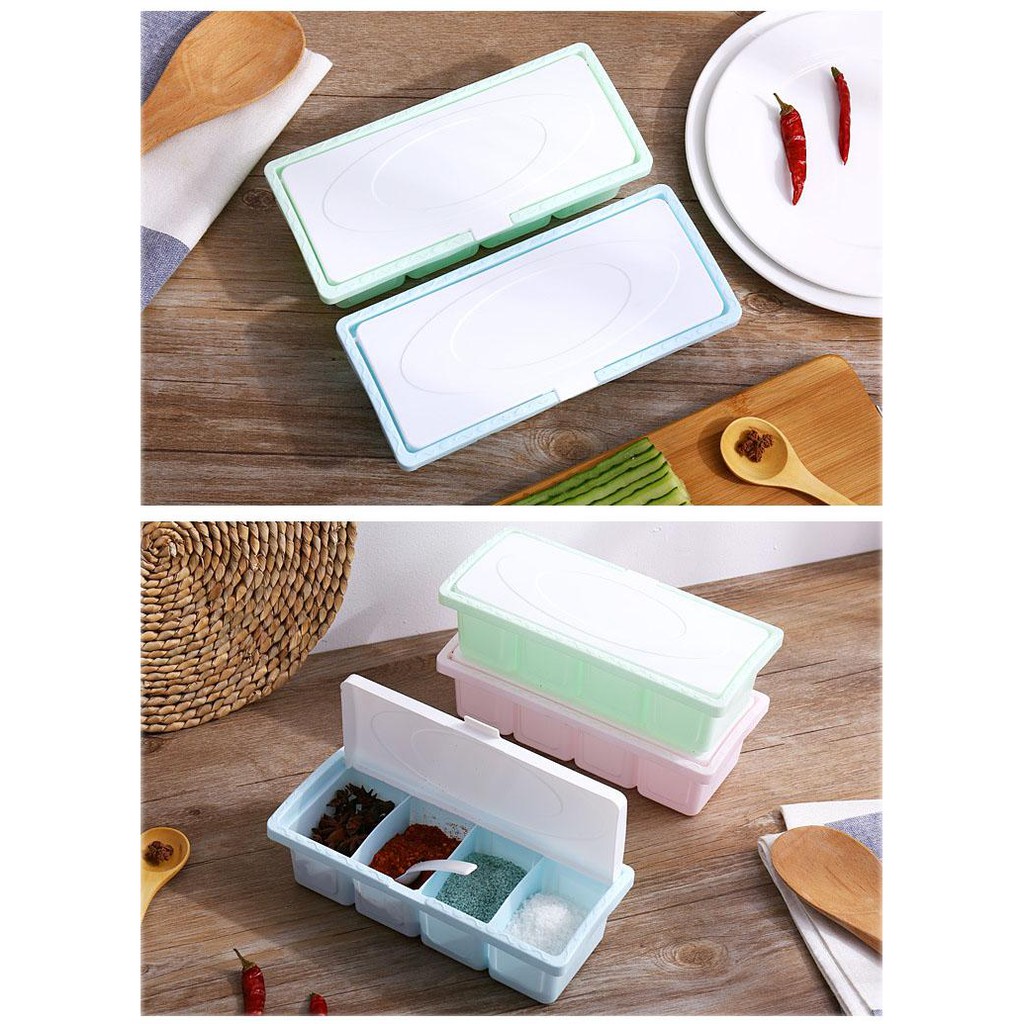 Hộp đựng gia vị được chia làm 4 ngăn tiện dụng cùng nắp đậy chắc chắn, giúp bảo quản gia vị tốt hơn. Chất liệu nhựa trong cao cấp, bền đẹp, cho thời gian sử dụng dài lâu. Sản phẩm có kèm muỗng tiện dụng, giúp bạn dễ dàng lấy lượng gia vị cần thiết khi chế biến món ăn. Thích hợp dùng để đựng gia vị như: đường, muối, tiêu, mì chính... hoặc những loại hạt khác. Nhiều màu sắc bắt mắt, sản phẩm còn góp phần tô điểm cho gian bếp nhà bạn.