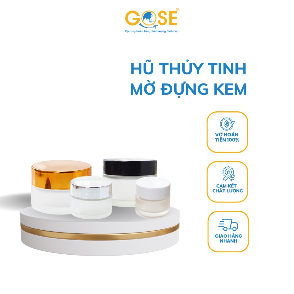 Giới thiệu Hũ thủy tinh đựng kem GOSE thân mờ bộ chiết mỹ phẩm nắp đen/trắng/vàng/bạc có đệm lót