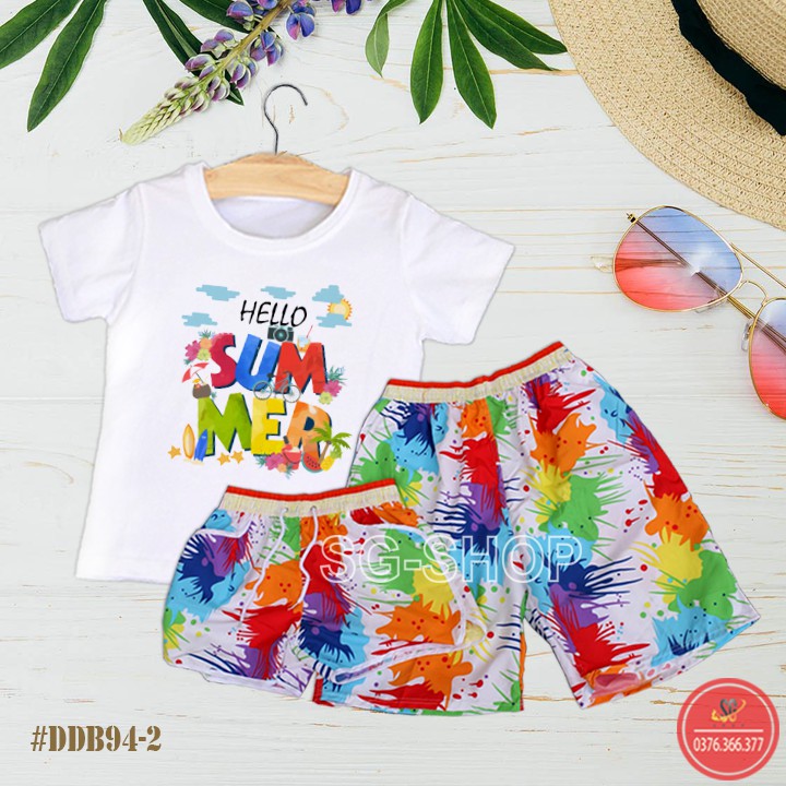 THÔNG TIN ĐỒ ĐI BIỂN: - Tên SP: Đồ đi biển summer - SP bao gồm: (áo và quần) Áo: Áo thun cổ tròn, tay ngắn, in hoạ tiết nổi bật "Summer". Quần: Quần short đi biển (quần ngắn cho nữ và quần dài ngang gối cho nam) - Size: từ 9-110kg. - Mã SP: DDB94-2