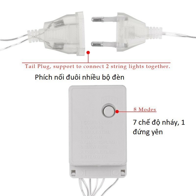 - Màu sắc: vàng và nhiều màu, khách chọn màu trong phân loại sản phẩm. có hộp điều chỉnh 07 chế độ chớp nháy và 01 chế độ đứng yên mãi mãi.