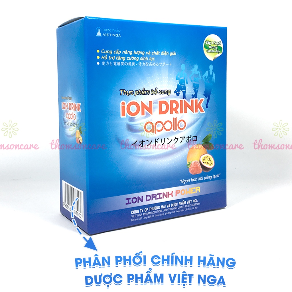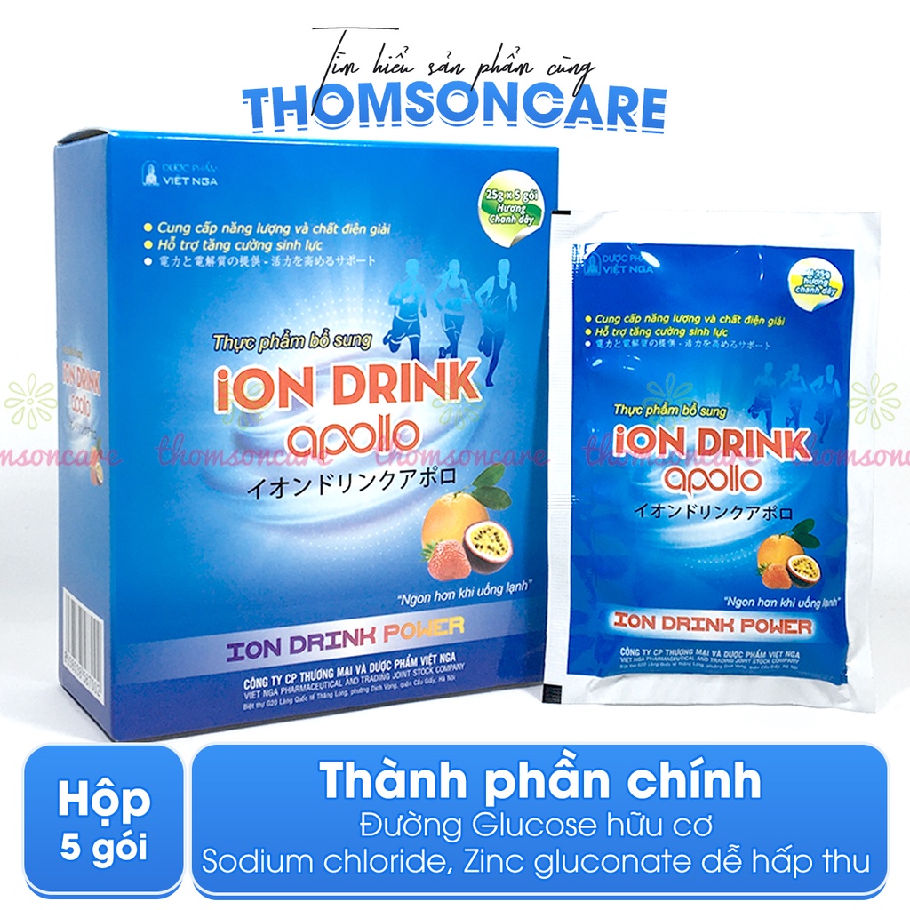 ======================= Thành Phần ion drink powder: Glucose khan , Natri citrat, Natri clorua, Kali clorua , Vitamin C Phụ liệu :Dextrose, Aspartame , Lactose , hương chanh ======================= Công dụng ion drink powder: - Giúp bổ sung đường và các chất điện giải cần thiết cho cơ thể , hỗ trợ giảm tình trạng mệt mỏi, suy nhược do mất điện giải. - Người bị mất điện giải do tiêu chảy , sốt cao, nôn mửa ra mồ hôi do lao động nặng nhọc ======================= Cách dùng ion drink powder: Hoà tan 1 gói 8g vào 200ml đun sôi để nguội lắc đều để uống. Trẻ em từ 2-10tuổi : uống từ 1-2 gói 8g / ngày chia 2 lần. Thiếu niên và người lớn : uống từ 2-4 gói 8g /ngày chia 2-4lần