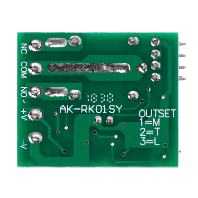Chế độ làm việc: Khoảnh khắc: Đẩy nút từ xa, rơ le kết nối, nhả nút từ xa, rơ le ngắt kết nối. Chuyển đổi: Đẩy sau khi nút điều khiển từ xa, rơ le kết nối, nhấn nút điều khiển từ xa hai lần, rơ le ngắt kết nối. Chốt: Đẩy nút từ xa A, rơ le kết nối, nhấn nút từ xa B, ngắt rơ le. Chế độ trễ buộc: Đẩy nút điều khiển từ xa, rơ le kết nối, từ khi nhả nút từ xa, sau 5 giây hoặc 10 hoặc 15 giây, rơ le tự động ngắt kết nối. Xóa mã: Đẩy nút học lên đầu thu trong 8 lần, mã sẽ được làm sạch. Sau khi xóa mã, tất cả điều khiển từ xa không thể hoạt động được nữa. Học mã: (thông thái) Đẩy phím học lên đầu thu một lần cho thời gian, nó nằm ở chế độ cài đặt thời gian. Chờ một chút, đèn LED sẽ tắt, dẫn đến trạng thái học tập. Nhấn nút từ xa, đèn LED báo trên bảng thu sẽ nhấp nháy sau đó tắt. Sau 3 giây, chỉ báo LED sẽ sáng lại, học thành công. Học mã: (Tấn đổi) Đẩy việc học để phím trên đầu thu hai lần, nó đi vào chế độ cài đặt chuyển đổi Chờ một chút, đèn LED sẽ tắt, dẫn đến trạng thái học tập. Nhấn nút từ xa, đèn báo LED trên bảng thu sẽ nhấp nháy sau đó tắt. Sau 3 giây, đèn báo LED sẽ sáng lại, học thành công. Học mã: (Đóng hàng) Lưu ý: Khi bạn chọn chế độ ngậm, để tìm hiểu thêm điều khiển từ xa, bạn cần học hai nút khác nhau, lần đầu tìm hiểu "ON", lần thứ hai học cho "TẮT". Ví dụ: nút A = BẬT, nút B = TẮT Đẩy học để tìm chìa khóa trên bộ thu trong ba lần, nó đi vào chế độ ngậm. Chờ một lúc, đèn LED chỉ báo trên bảng thu sẽ nhấp nháy sau đó com