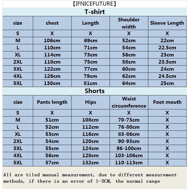 Thương hiệu: IFNICEFUTURE Phong cách hàng đầu: Áo phông Vải: Khác Chiều dài tay áo: tay áo ngắn Chiều dài: quần năm phần tư Thành phần nguyên liệu: 100% sợi polyester Màu sắc: Trắng, xám nhạt đen Nâu xanh Klein Kích thước: M L XL 2XL 3XL 4XL 5XL