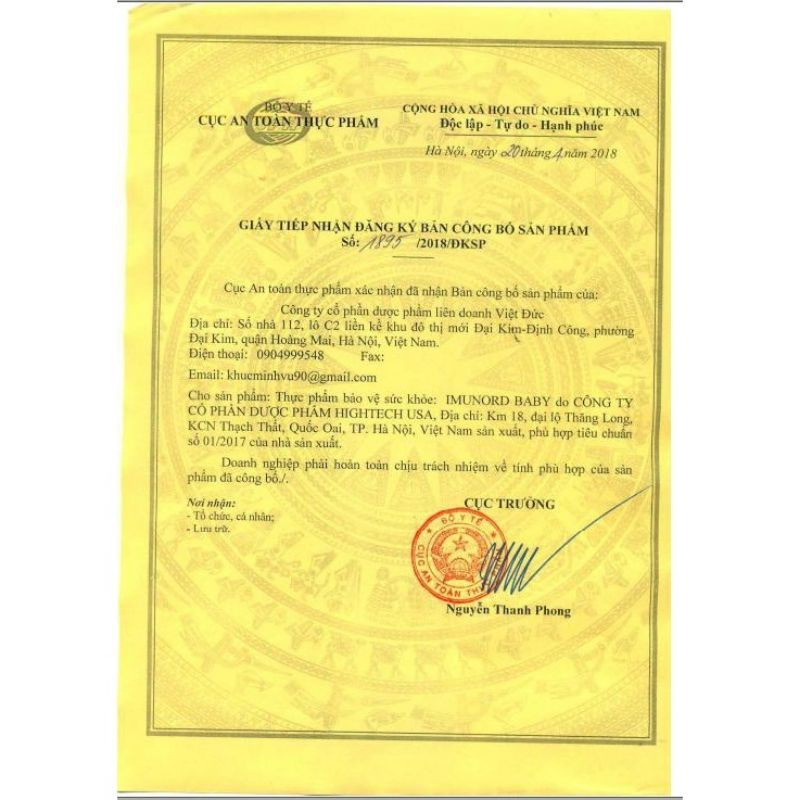 Imunnord baby - giúp ăn ngon miệng, hỗ trợ miễn dịch Thành phần: Beta glucan 1000mg, Zn gluconate 400mg, Vitamin C 20mg