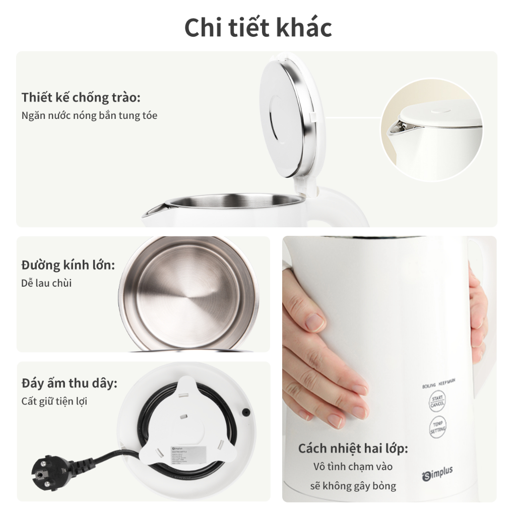 💥 ĐẶC ĐIỂM NỔI BẬT 1. Kiểm soát nhiệt độ thông minh: Công nghệ hằng nhiệt, không đun lại nhiều lần, đầu dò kiểm soát nhiệt độ, tắt nguồn khi nước sôi, ngắt điện khi cạn nước 2. 7 chế độ kiểm soát nhiệt, Giữ nóng tới 12H: 45/55/65 độ trong 12 giờ, 75/85/95 trong 4 giờ 3. Lõi ấm: Thép không gỉ 304 cấp thực phẩm, công nghệ đúc khối, không cặn và dễ làm sạch, đun nước an toàn không mùi 4. Làm nóng: Công suất cao 1500W, Đế làm nóng cao cấp, nhiệt độ tăng nhanh và đều, làm nóng chỉ 5 phút (đo thực tế 6 phút) 5. Dung tích: Dung tích lớn 1.8L, đáp ứng nhu cầu nước cả ngày (thực tế là 1.7L) 6. Điều khiển: Cảm ứng thông minh 3 chế độ đun: chế độ đun sôi (tự ngắt sau khi đun sôi), chế độ giữ nhiệt (đun sôi trước, sau khi sôi tự giảm xuống nhiệt độ xác định), chế độ nhiệt độ chính xác (đun trực tiếp đến nhiệt độ chỉ định), giữ nước ấm vào mùa đông, nước đun sôi để nguội vào mùa hè, Dùng tiện lợi trong cả năm 7. Thông tin chi tiết: Đế ấm thu dây (thuận tiện cất giữ, không chiếm diện tích), mở nắp bằng một nút bấm, thân ấm hai lớp chống bỏng (tránh bỏng tay khi nhiệt độ cao), nắp ấm kích thước lớn (thêm nước và làm sạch dễ dàng ); thiết kế tách rời (Dễ sử dụng, dễ vệ sinh) 8. Chức năng ghi nhớ 3 phút: Sau khi nhấc ấm và đặt lại sẽ tự động trở về trạng thái hoạt động, không cần cài lại