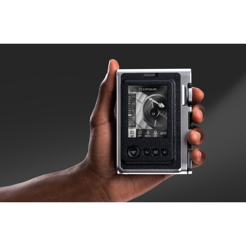 Instax Mini Evo Hybrid có thiết kế giống Instax Mini 90 Neo với thân máy được bọc da PU kết hợp cùng khung viền chrome tạo điểm nhấn mang lại vẻ đẹp cổ điển nhưng vẫn không mất đi nét thời thượng.