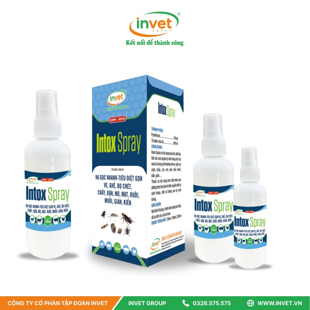 1-THÀNH PHẦN Pyrethriod …..................... 20mg Tá dược vừa đủ ….......... 100 ml 2-TÁC DỤNG Intox Spray có tác dụng kéo dài, diệt hầu hết các loại ngoại ký sinh trùng trên vật nuôi và trong môi trường như ve, ghẻ, bọ chét, chấy, rận, mò, mạt, ruồi, muỗi, kiến, gián,… SP có tác dụng trực tiếp hoặc qua đường tiêu hóa làm tê liệt và giết chết ký sinh trùng, diệt cả trứng của ký sinh trùng. 3-CÁCH DÙNG '* Liều dùng: + Chó: 10-12 lần xịt/kg TT. + Mèo: 5-6 lần xịt/kg TT. - Diệt ve, ghẻ, bọ chét, bét, tích: Dùng 2 lần cách nhau 10-15 ngày, tùy vào mức độ nhiễm. Dùng 6 tháng 1 lần để phòng. - Diệt chấy, rận: Dùng 1 lần duy nhất. - Diệt ruồi, muỗi, gián, kiến: Dùng thường xuyên. * Cách dùng: Lắc kỹ trước khi xịt. Giữ bình thẳng đứng, phun ngược chiều lông với khoảng cách 20-30cm. Xoa cho thấm đều khắp cơ thể, đặc biệt là vùng ký sinh trùng cư trú. Không tắm cho thú trước và sau dùng SP 48 giờ. * Chú ý: SP chỉ dùng xịt bên ngoài cho gia súc, ăn, uống khi xịt , Rửa kỹ chân tay bằng xà phòng và nước nóng sau khi xịt SP cho gia súc. 4-CHỐNG CHỈ ĐỊNH Không sử dụng cho thú mẫn cảm với thành phần của SP 5-BẢO QUẢN Nơi khô thoáng, tránh ánh sáng trực tiếp, nhiệt độ không quá 30 độ C 6-QUY CÁCH CHAI 100ML TẬP ĐOÀN INVET VIỆT NAM SẢN XUẤT