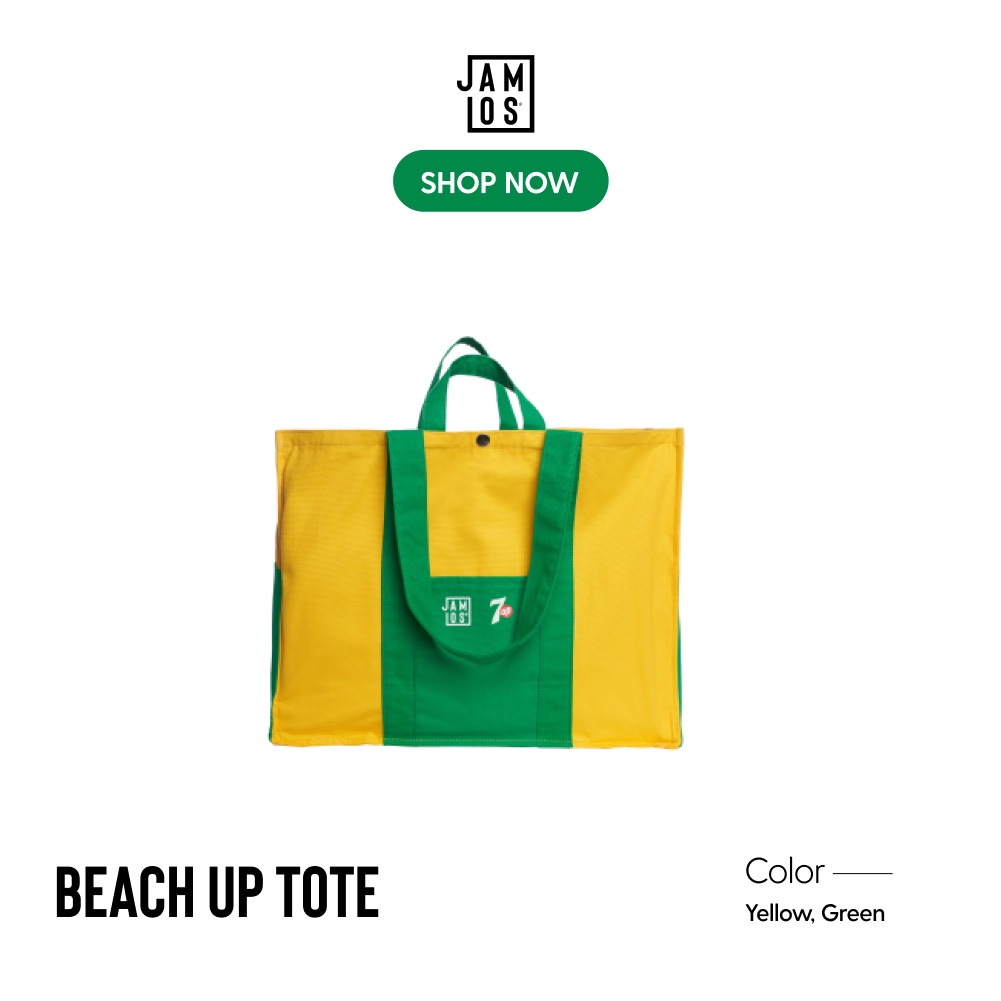 Jamlos collab 7Up BEACH UP TOTE Chữ UP được để ở phần hông túi, khi đeo lên, chữ UP dù được quay ra trước (khi đeo vai phải) dù được quay ra sau (đeo vai trái) thì người nhìn vào cũng sẽ thấy chữ UP quay về phía họ. Cũng như thông điệp Live Up, thì chiếc túi size to dành cho đi biển này, mang thêm không khí và năng lượng từ biển, Beach Up = Let's go to the beach & up your mood!