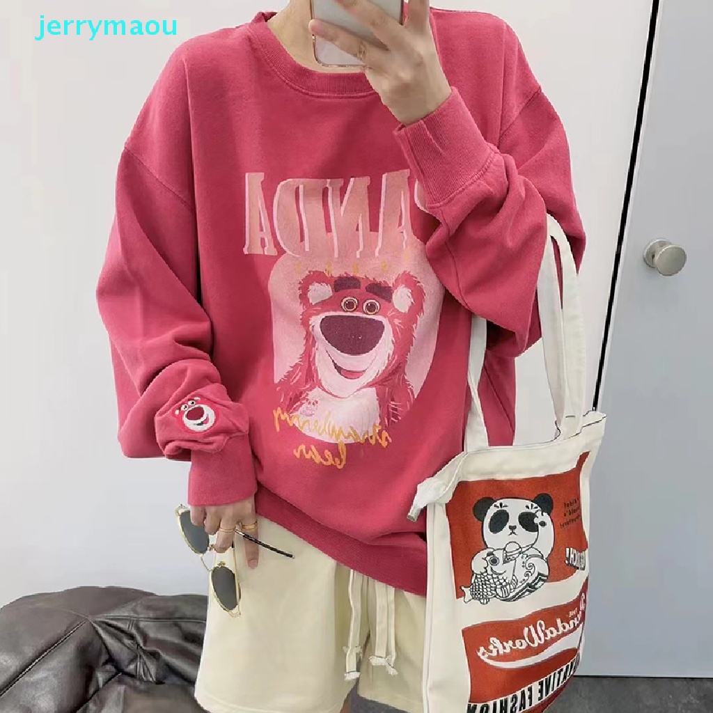 Giới thiệu [JER] Áo Sweatshirt Chui Đầu Dáng Rộng Tay Dài Họa Tiết Gấu Dâu Tây Hoạt Hình Thời Trang Hàn Quốc HBC