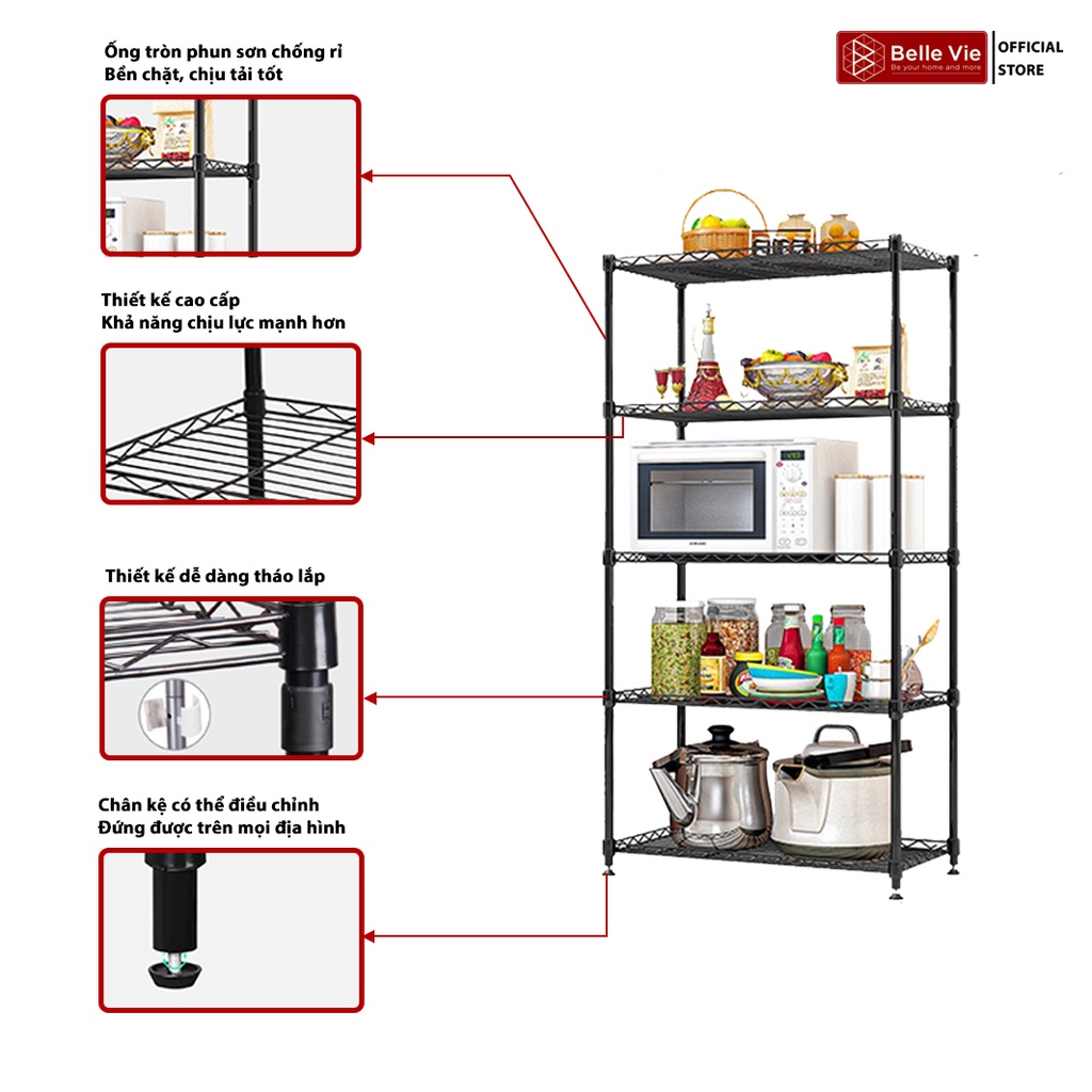 - Toàn bộ khung và giá kệ bằng thép không gỉ được sơn tĩnh điện chống xước giúp sản phẩm luôn bóng đẹp trong thời gian dài. - Phù hợp với nhiều không gian, mục đích khác nhau như kệ bếp, kệ sách, kệ để tiểu cảnh, để phòng tắm... - Tối ưu không gian nhà trở nên gọn gàng và ngăn nắp hơn. - Khay sắt được làm mắt lưới khá sáng tạo tạo sự mới mẻ và tiện lợi nhất. - Tải trọng đồ lên đến 200kg chia đều các tầng mà không lo bị yếu. - Đặc biệt 4 đế chân có gen điều chỉnh kích thước thông minh để phù hợp với nhiều không gian khác nhaU