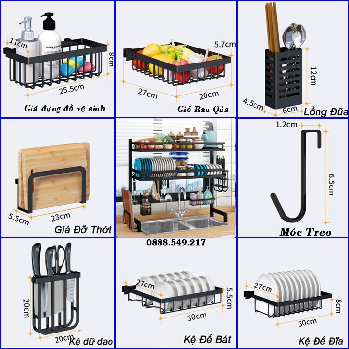 *** Kệ Chén 2 Tầng tích hợp 9 Công dụng trong 1 sản phẩm: 1. Rổ để bát với sức chứa lên đến 26 cái. 2. Rổ để đĩa có thể đựng cùng lúc gần 30 đĩa to nhỏ các loại. 3. Rổ đựng xoong chảo cực lớn (có thể đựng các loại tô, bát lớn,..) 4. Ống đựng đũa thiết kế đặc biệt giúp giảm thiểu khả năng đũa bị rơi, lọt ra bên ngoài, phía dưới có đục lỗ để thoát nước, không gây mốc các loại đũa gỗ. 5. Rổ đựng nước rửa chén, mút rửa chén, các loại chất tẩy rửa khác. 6. Giá đựng thớt, nắp vung, nắp nồi. 7. Ống đựng dao, kéo chắc chắn, an toàn, bảo vệ tuyệt đối cho người sử dụng. 8. Bộ 5 móc treo tiện lợi, treo các loại vá, kéo, khăn lau bếp... 9. Bộ kệ bát cũng là 1 vật trang trí tuyệt đẹp cho cả gian bếp ấm cúng của bạn.