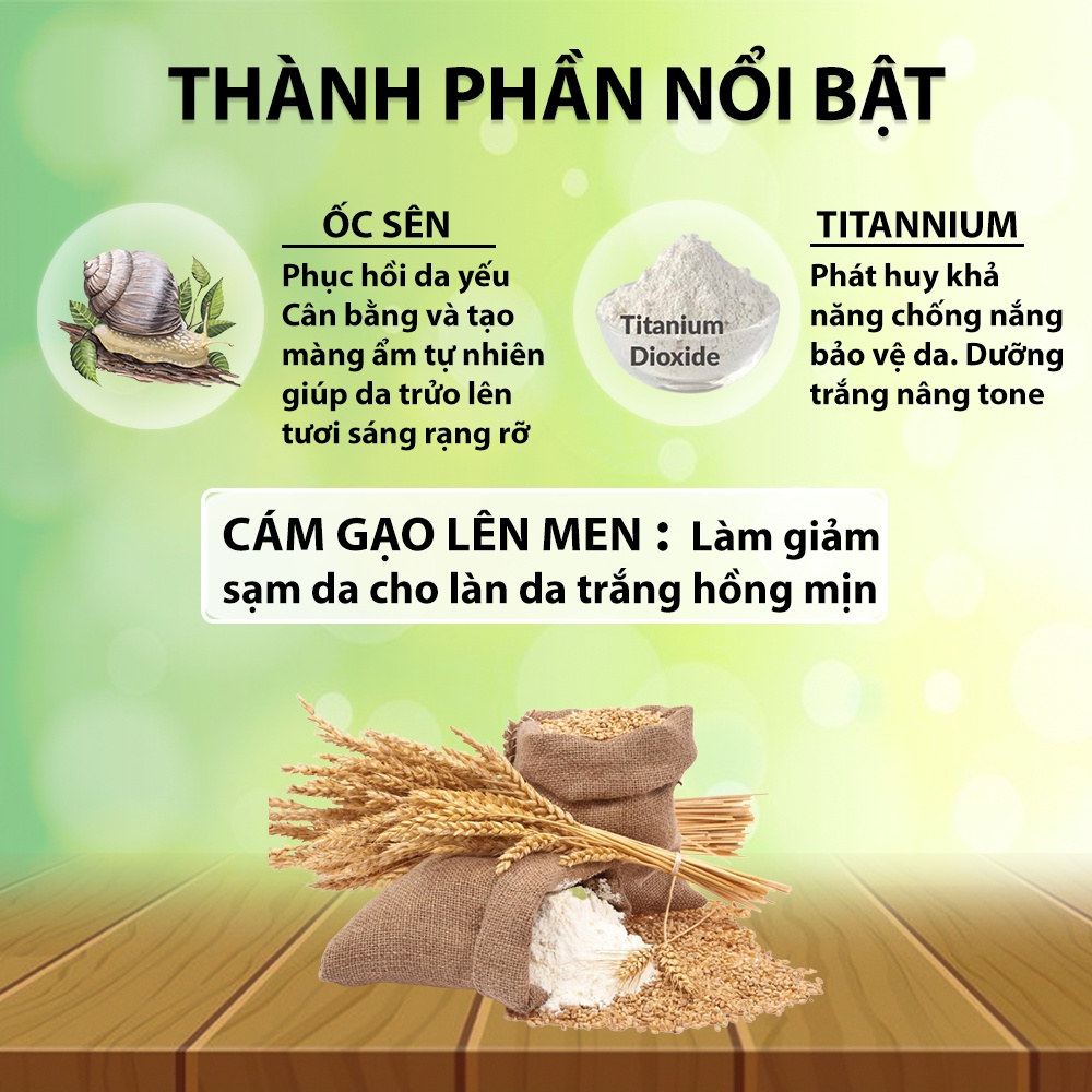 ● THÀNH PHẦN & CÔNG DỤNG: - Sản phẩm chiết xuất từ thiên nhiên chứa các thành phần như: Titanium Dioxide, C15-19 Alkane, ethylhexyl methoxycinnamate, dịch ốc sên, cám gạo lên men,... -Dưỡng trắng chuyên sâu: Giúp làn da mịn màng như lụa, trắng da ,loại bỏ sắc tố đen phục hồi làn da từ sâu bên trong, cung cấp độ ẩm .Kem có thành phần nano phân tử nước dạng sữa chua siêu thẩm thấu không bết dính hay lộ vân kem. - Sản phẩm giúp da giữ ẩm và bảo vệ da dưới tác động độc hại của môi trường và ánh nắng mặt trời.