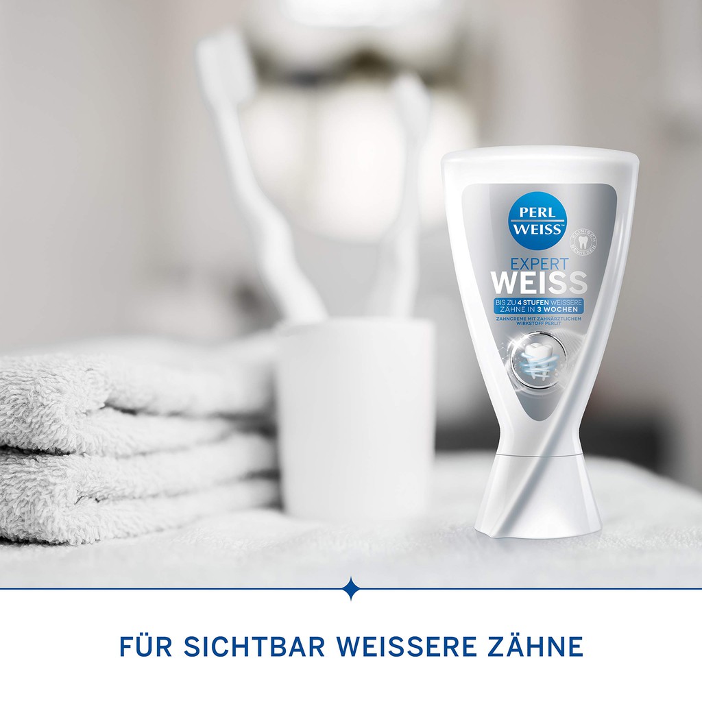 Kem đánh răng Perl weiss Expert White Toothpaste 50ml - Xuất xứ: Đức - Tính năng sản phẩm • ✔ HIỆU QUẢ: Kem đánh răng chuyên dụng dùng hàng ngày cho hàm răng trắng hơn rõ rệt sau một tuần và răng trắng lên 4 cấp độ sau 3 tuần. • ✔ Giống như từ phụ gia nha khoa: làm sạch sâu chuyên sâu với chất Perlite nha khoa cho răng mịn, sạch và sáng bóng rõ rệt. Kết quả: một cảm giác miệng sạch sẽ như sau khi làm sạch răng chuyên nghiệp. • ✔ Chống lại sự đổi màu: Loại bỏ sự đổi màu và mảng bám hàng ngày một cách hiệu quả và mang lại cho răng vẻ mới, sáng bóng rạng rỡ. • ✔ Bảo vệ toàn diện: bảo vệ chống sâu răng nhờ chất florua và tăng cường men răng. • ✔ Đã được chứng minh lâm sàng: Hiệu quả đã được chứng minh lâm sàng, không chứa peroxide, không vi nhựa, không chứa gluten.