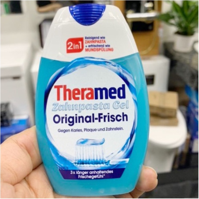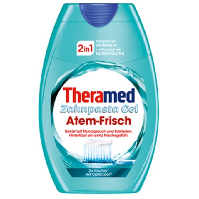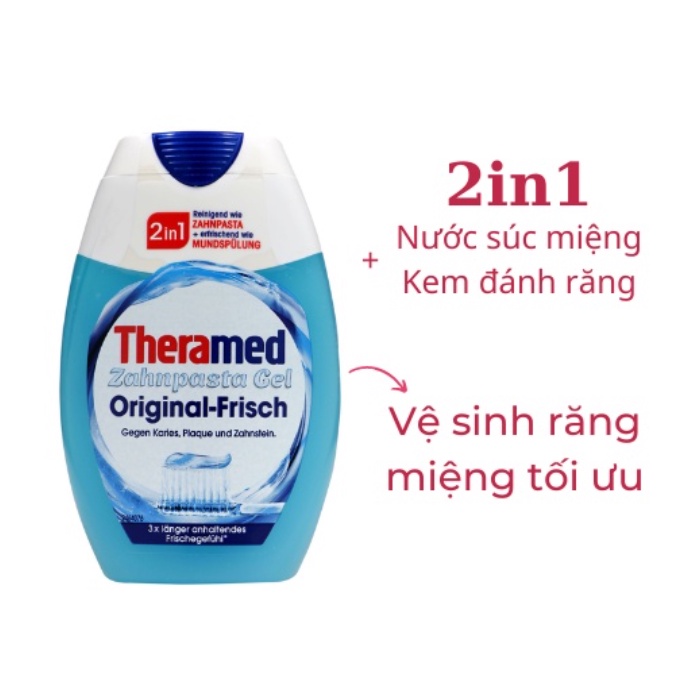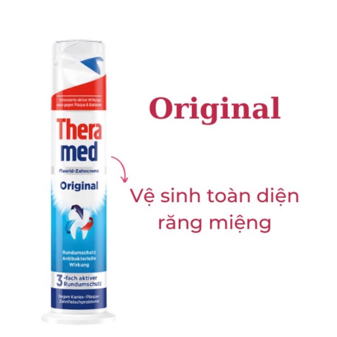 Xuất xứ: Đức Thương hiệu: Theramed Dung tích: Dạng ống 100ml, loại 2in1 75ml Kem đánh răng Theramed với tác dụng ngừa khuẩn, giúp bảo vệ tích cực rất lâu sau khi đánh răng.