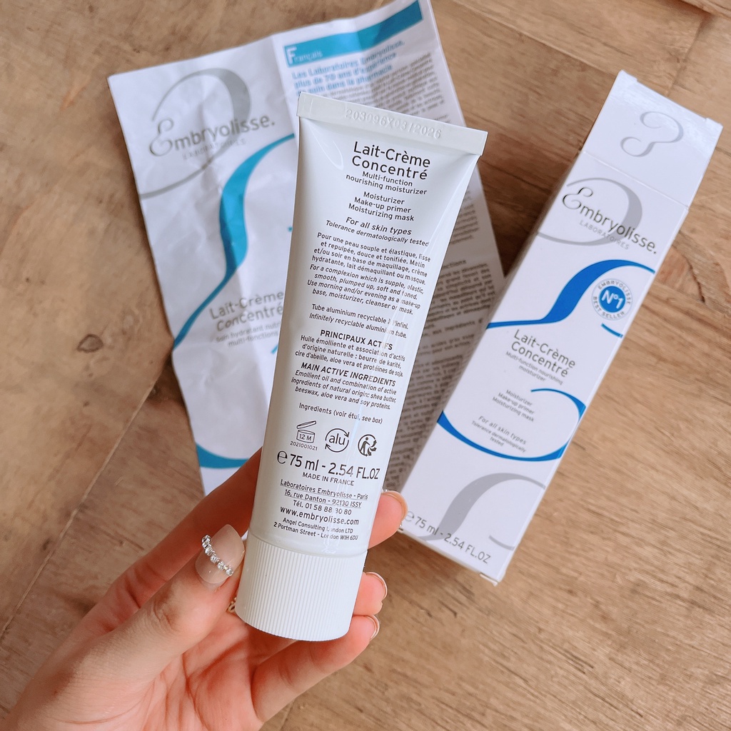 Kem dưỡng ẩm Embryolisse Lait-Crème Concentré được mệnh danh là loại kem phải trong túi của các nghệ sĩ trang điểm, người mẫu và người nổi tiếng. Xuất hiện ở hàng loạt các buổi chụp ảnh, ghi hình, và quay phim trên toàn thế giới. Kem dưỡng da này là sản phẩm 3 trong 1: kem lót, kem dưỡng ẩm, và tẩy trang. Công thức của nó cực kỳ đơn giản và hiệu quả với các thành phần dinh dưỡng phục hồi ánh sáng tự nhiên của da và tạo ra một làn da khỏe mạnh. Kem có màu trắng, không quá đặc hoặc quá lỏng và khá dễ tán. Khi thoa lên mặt thì chuyển thành không màu.