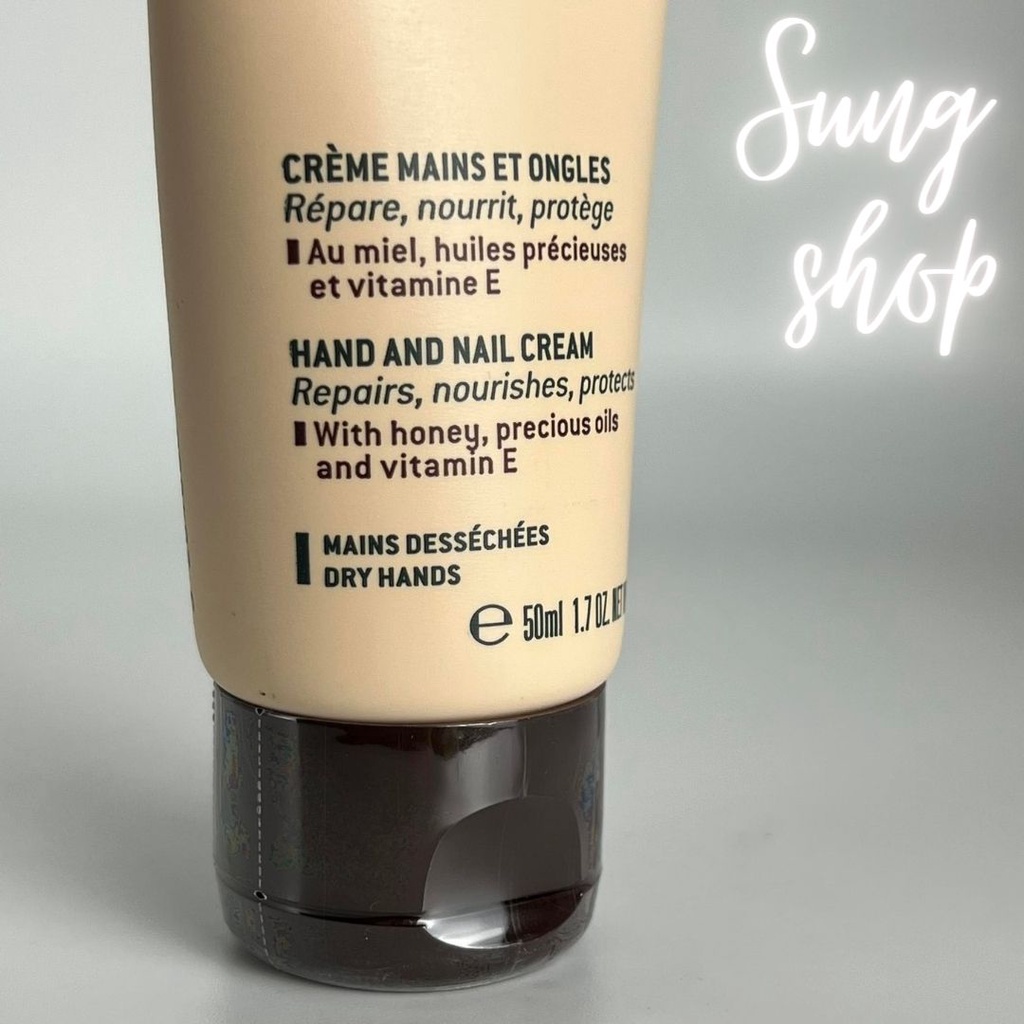 -------CÔNG DỤNG------- - Tinh chất mật ong, dầu hướng dương và vitamin E - Nuôi dưỡng cho cả da tay và móng mềm mại, mịn màng và ngăn ngừa lão hóa - Giúp móng mượt và bóng khỏe hơn sau khi dùng - Hương thơm cực kỳ sang đúng chất Pháp - Không chứa dầu khoáng, nguyên liệu từ động vật paraben và hạt vi nhựa