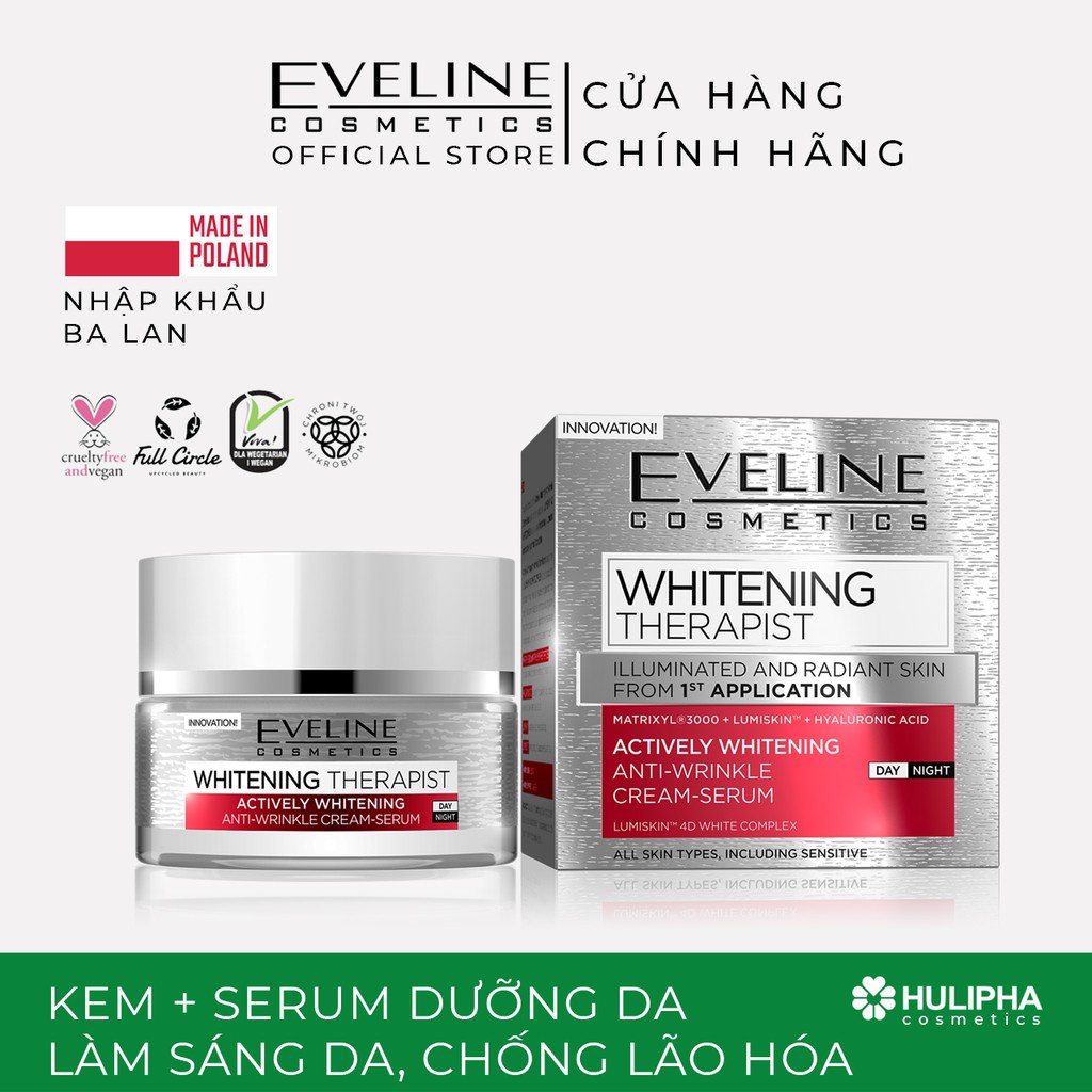 Sản phẩm kem dưỡng trắng da Whitening sản phẩm của thương hiệu Eveline nổi tiếng tại Ba Lan. Sản phẩm với công nghệ tiên tiến sẽ giúp cho kem tác động sâu hơn, dưỡng trắng tốt hơn và chống lão hóa. 2. Công dụng Sản phẩm kem dưỡng trắng với công dụng dưỡng ẩm, dưỡng trắng sáng da Ngoài ra thúc đẩy tái tạo da, cho làn da khỏe mạnh rạng ngời. Khả năng chống oxi hóa, làm chậm quá trình lão hóa. Dưỡng ẩm và mềm da, cho làn da căng mịn. Ức chế sự sản sinh melanin gây nám tàn nhang. Công nghệ tiên tiến giúp các phân tử kem mỏng nhẹ dễ dàng thẩm thấu. Có thể sử dụng được với mọi loại da.