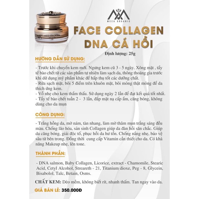 Hướng dẫn sử dụng Kem Face Collagen DNA Cá Hồi: - Bước 1: Trước khi sử dụng sản phẩm thì nên làm sạch da mặt bằng nước sạch hoặc sữa rửa mặt ( Tẩy tế bào chết 2 lần/ tuần, việc tẩy tế bào chết rất quan trọng. Tế bào chết được xem là lớp cản giữa bề mặt da và kem, từ đó các tinh chất của kem không thể thẩm thấu hết được vào da, thì sản phẩm sẽ không đạt hiệu quả như mong đợi) - Bước 2: Lau khô mặt. Dùng ngón tay lấy một lượng kem vừa đủ thoa đều lên da mặt. - Bước 3: Massage nhẹ nhàng và vỗ nhẹ nhàng lên da mặt cho các tinh chất thẩm thấu hết vô trong da.